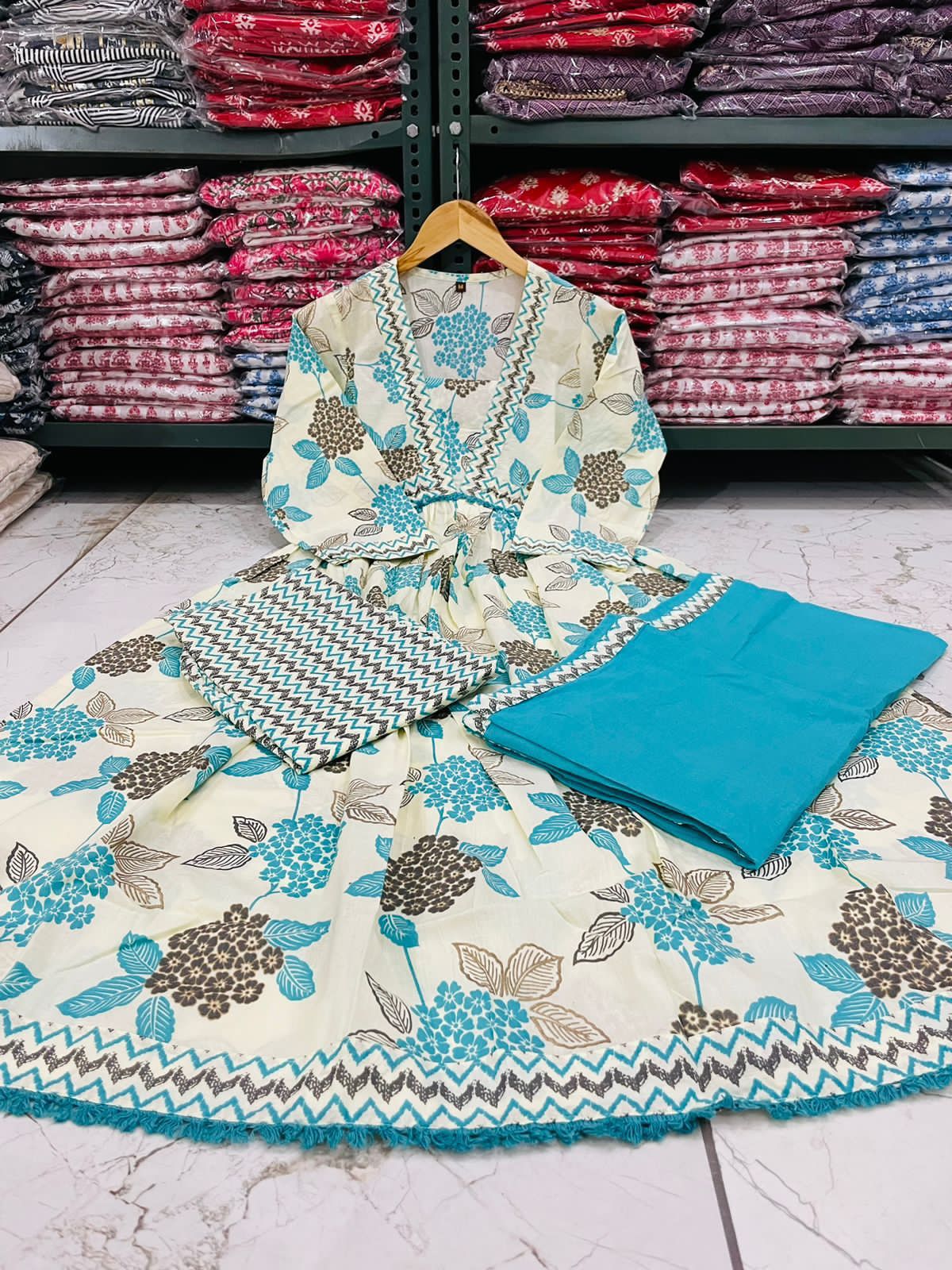 For a Festive gathering, Floral Anarkali suit set which is decorated with finest embroidery, side waist tassels and motifs.It is paired with matching Pants and dupatta