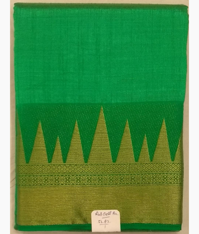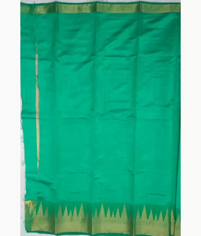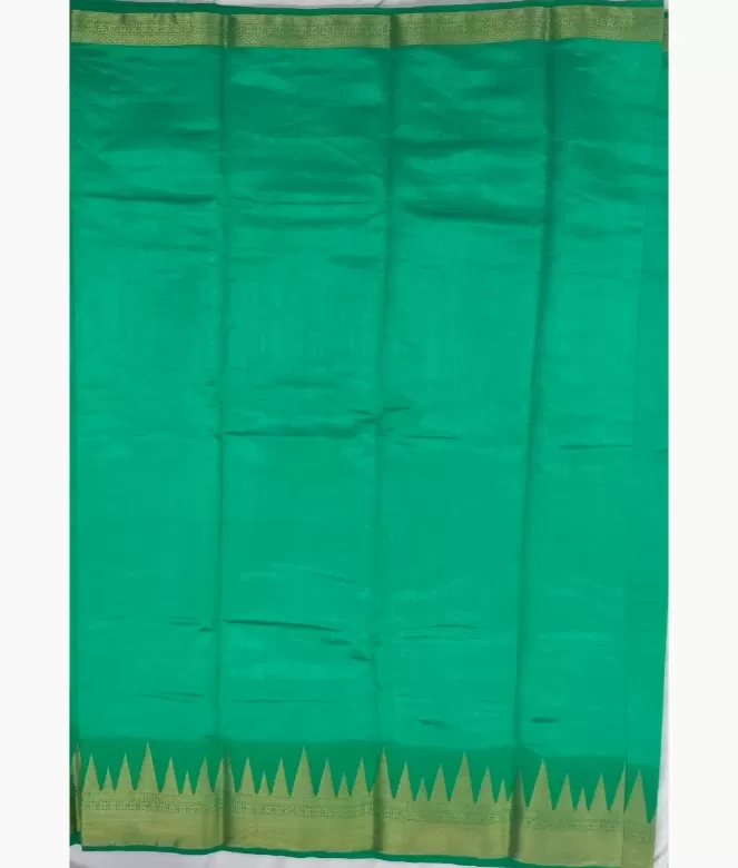 Border is of temple design in golden colour zari work with jute cloth design. Matching same border of saree is on blouse patti for neck and sleeves.