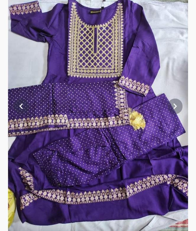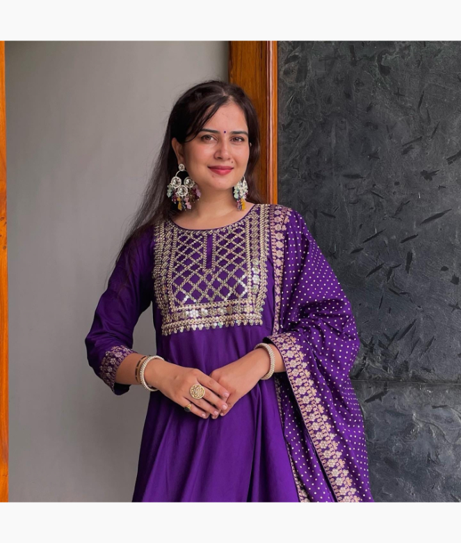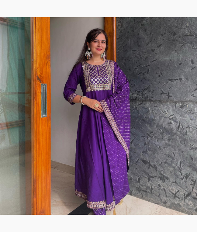 Step into elegance with our Glorious Purple Rayon Stitched Anarkali Suit Set. Crafted from soft rayon, this stunning outfit features intricate embroidery that adds a touch of sophistication to your wardrobe. The flowing silhouette of the anarkali design ensures a flattering fit, making it perfect for festive occasions and celebrations. Whether paired with statement jewelry or minimal accessories, this suit set will have you looking radiant and stylish, ready to make a statement wherever you go.