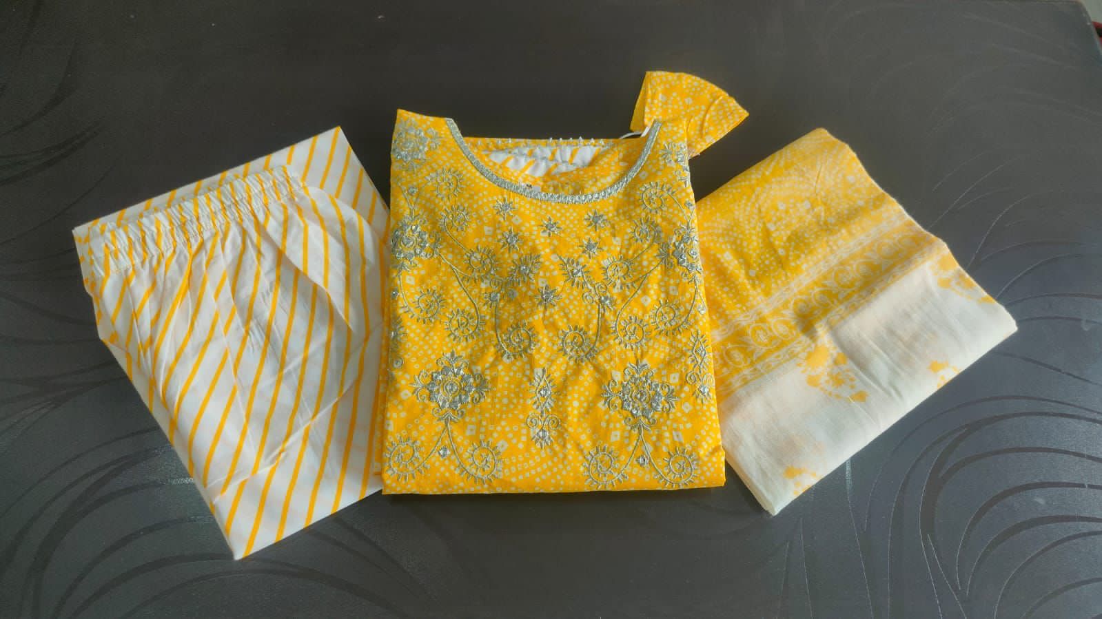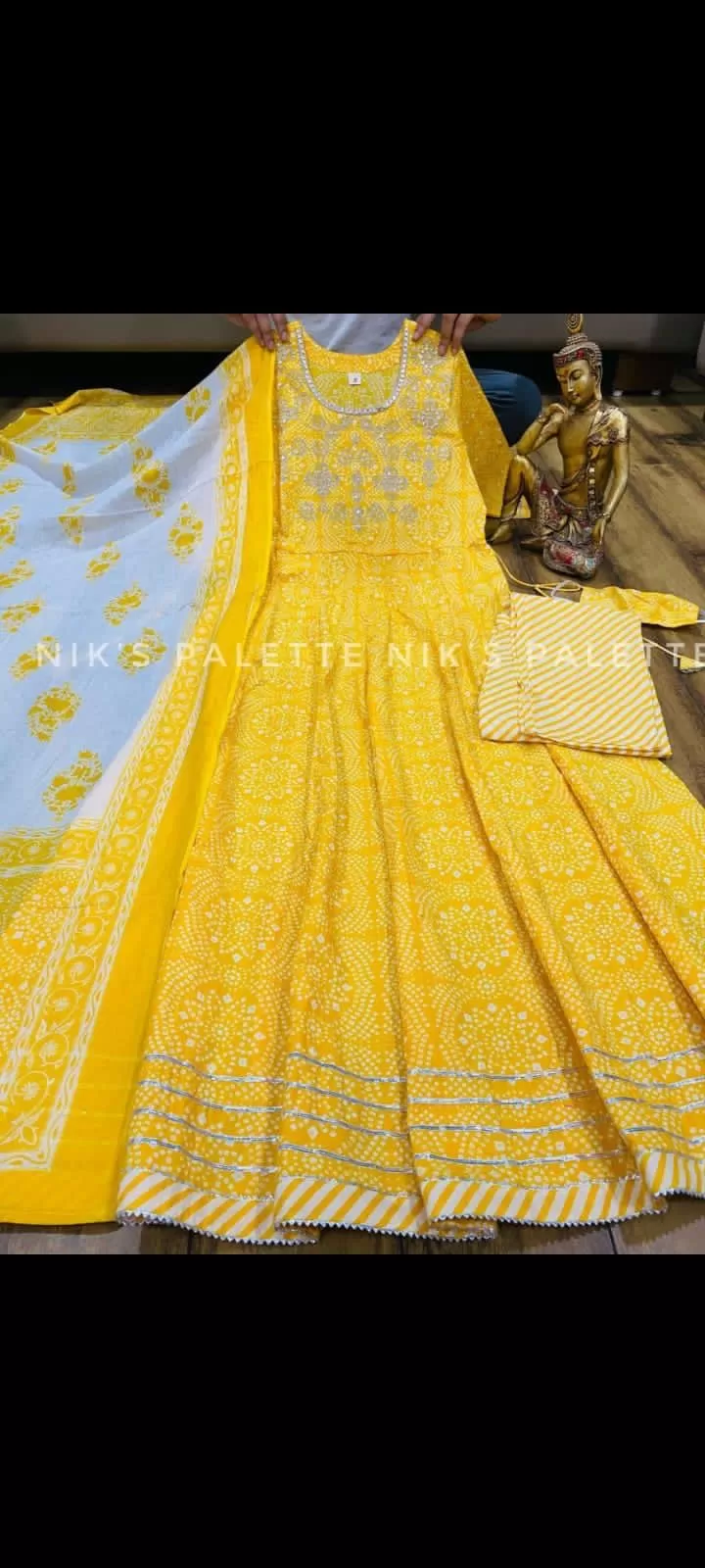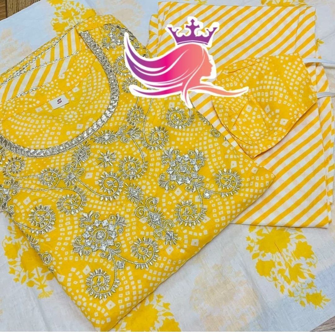 Premium Cotton Anarakali gown paired with pant & duppata detailed with gota & gold liquid zari .