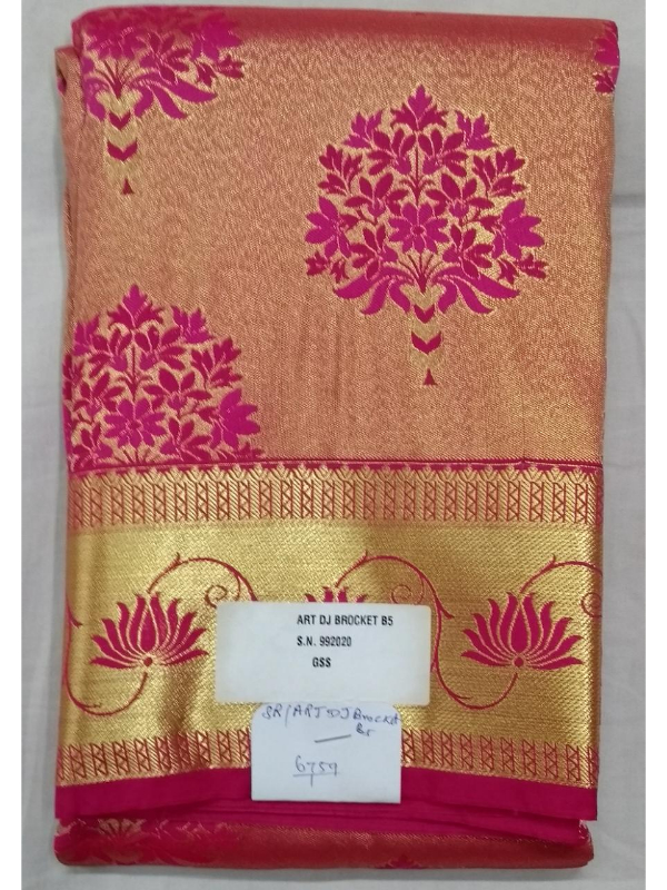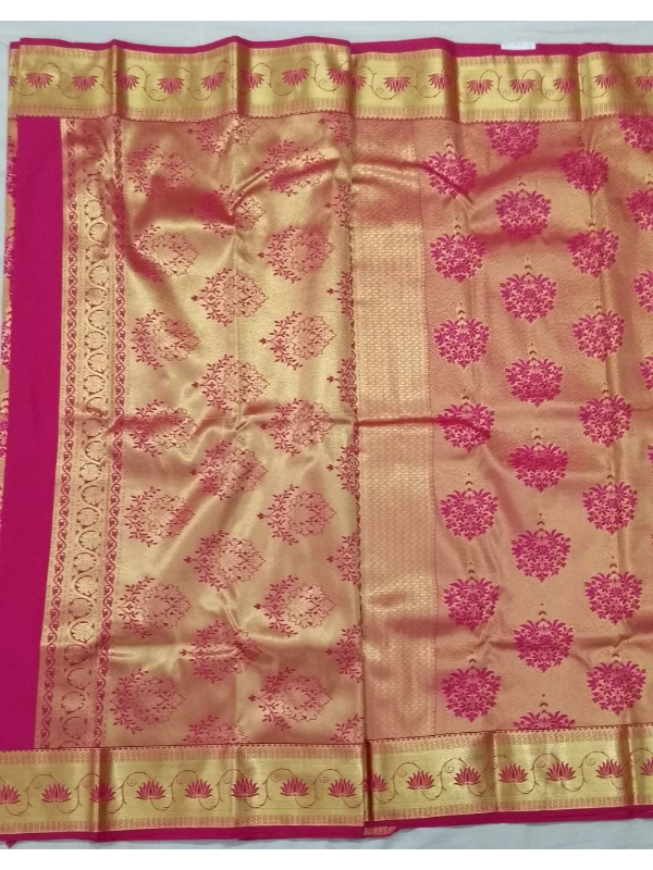 All over golden Zari flower design on saree. Golden colour Zari weaving booty on all over saree heavy pallu and border work on saree. Matching work of saree is on blouse border patti for neck and sleeves.