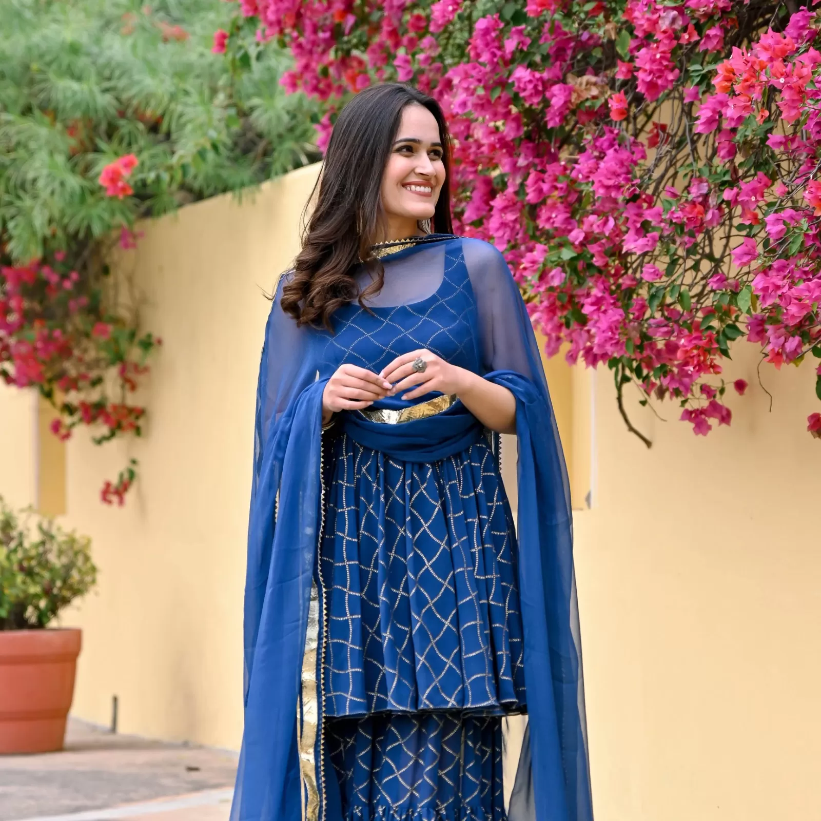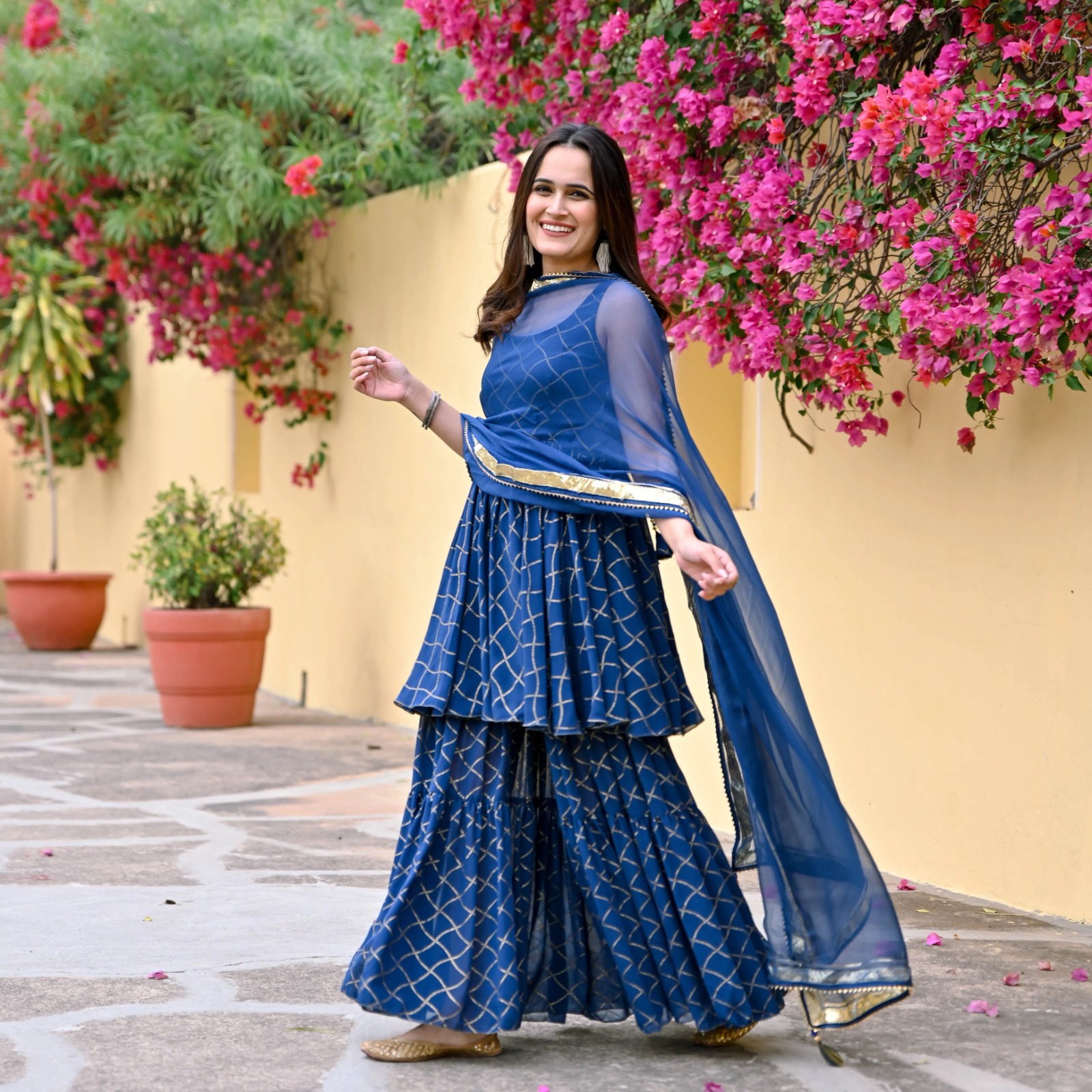 Fabulous Stitched Cotton Blue Sharara Suit Set
