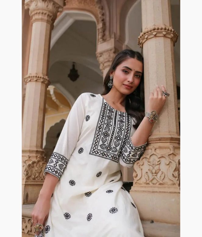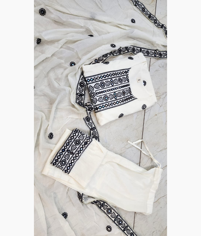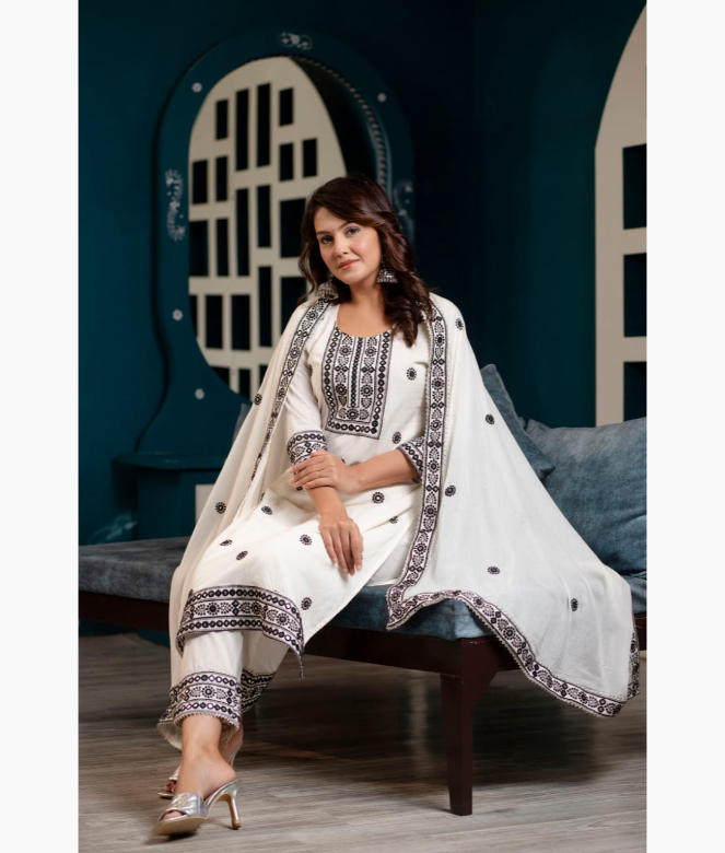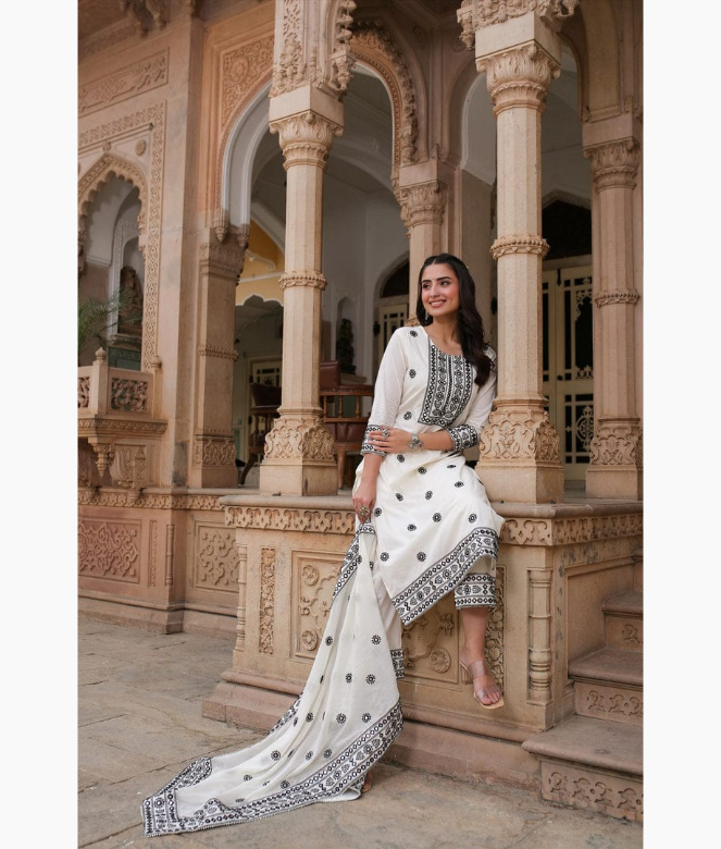 This stunning white cotton Kutch embroidery long kurta is a perfect blend of elegance and tradition. Featuring intricate mirror work and soft cotton voile lining, it drapes beautifully, ensuring comfort and style. The kurta is paired with solid cotton wide-leg palazzo pants, adorned with exquisite Kutch embroidery and a delicate gota lace border, adding a touch of sophistication. To complete the ensemble, the cotton mulmul Kutch embroidery dupatta, also featuring a gota lace border, adds an extra layer of charm. Ideal for festive occasions or special gatherings, this set beautifully showcases artistry and grace.