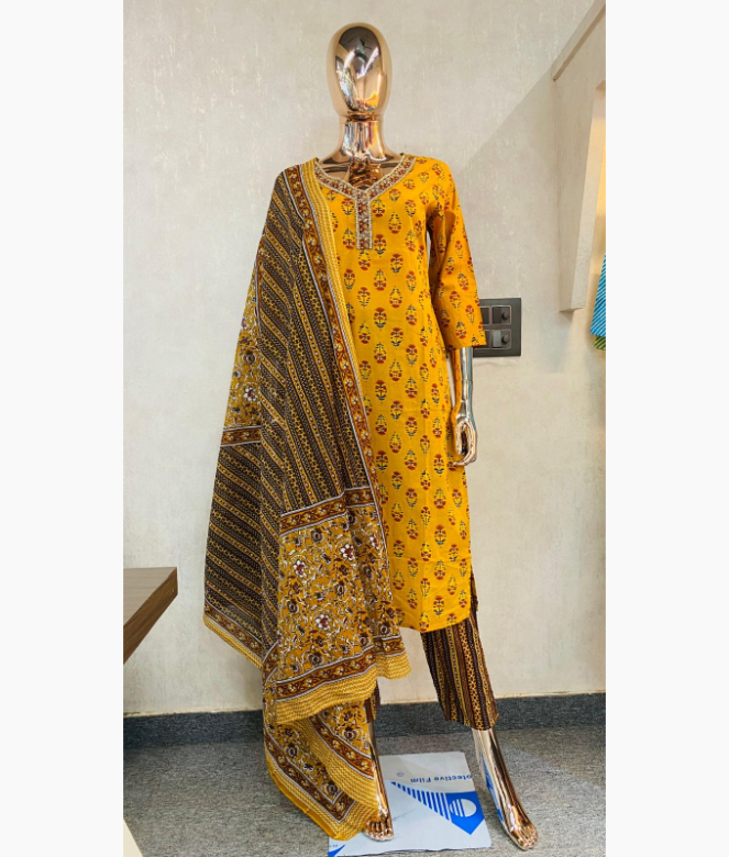 Home  /  Suit & Dress Material  /  Party Wear Suits / Beautiful Cotton Yellow Stitched Straight Suit Set