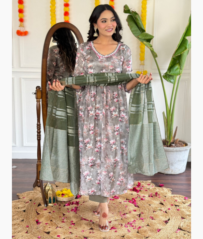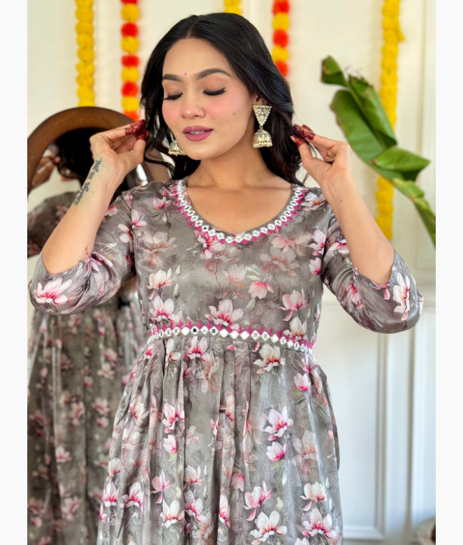 Beautiful Designer Floral Printed Embroidery Grey Stitched Suit Set