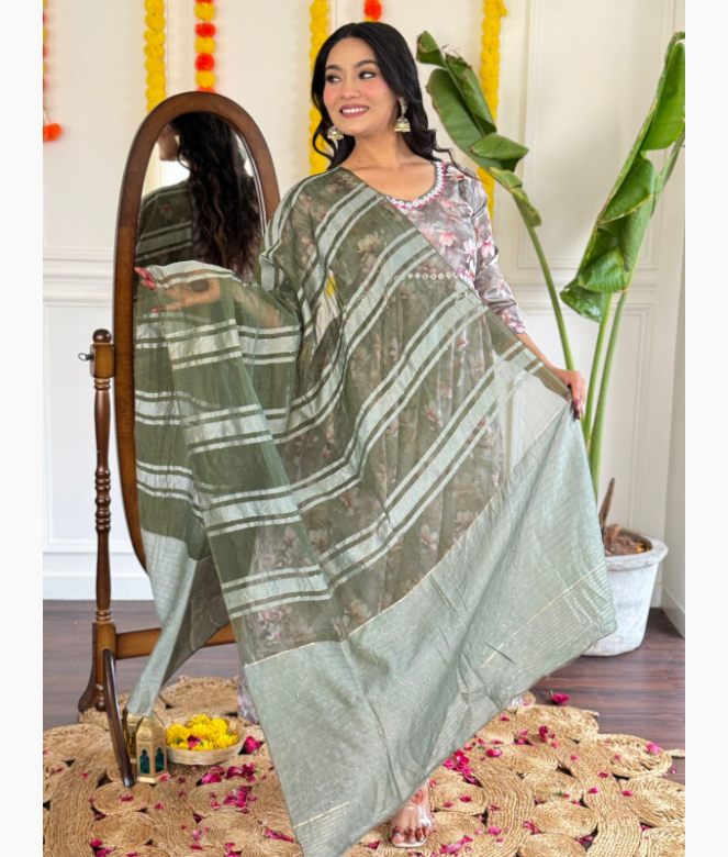 This beautiful designer kurti pant dupatta set features a stunning floral print, crafted from premium digital chinnon fabric. The intricate mirror embroidery on the yoke adds a touch of elegance, making it perfect for festive occasions or casual outings. The lightweight fabric ensures comfort while the vibrant design keeps you stylish. Ideal for pairing with statement jewelry and chic footwear!