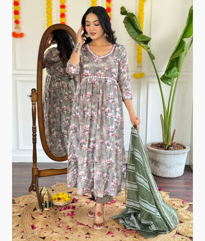 Beautiful Designer pattern Floral print kurti pant dupatta set in Premium digital chinnon  pure with fine mirror embroidery adda on yoke.