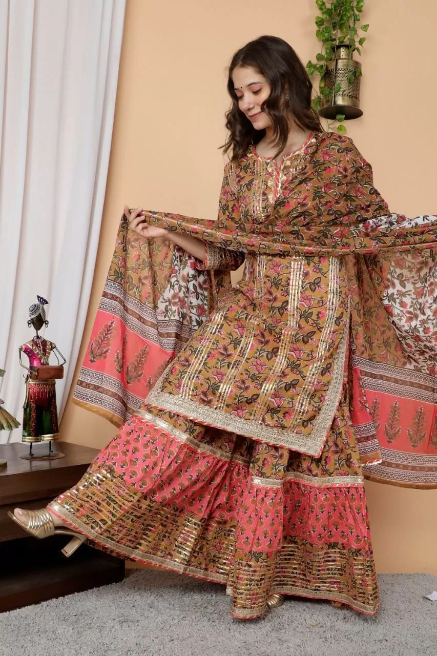 A beautiful Sharara suit set is a traditional Indian outfit that consists of a flared sharara a long tunic kurta and a dupatta.