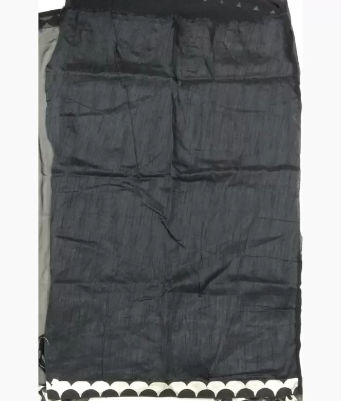 Frill design on all over saree border is of round design printed fabric in contrast colour. Blouse is of row silk fabric with matching same frill design patti for sleeves.