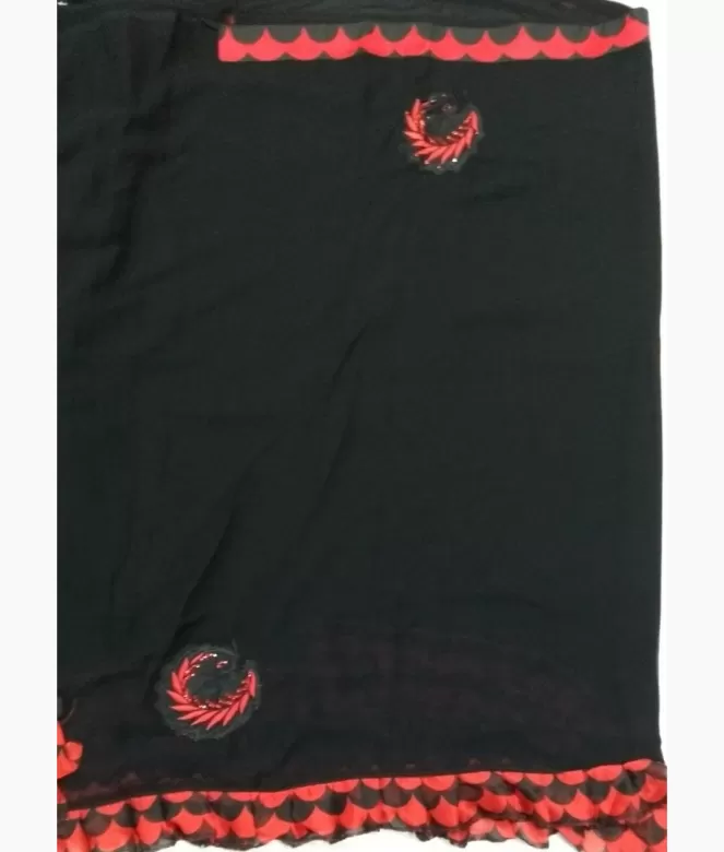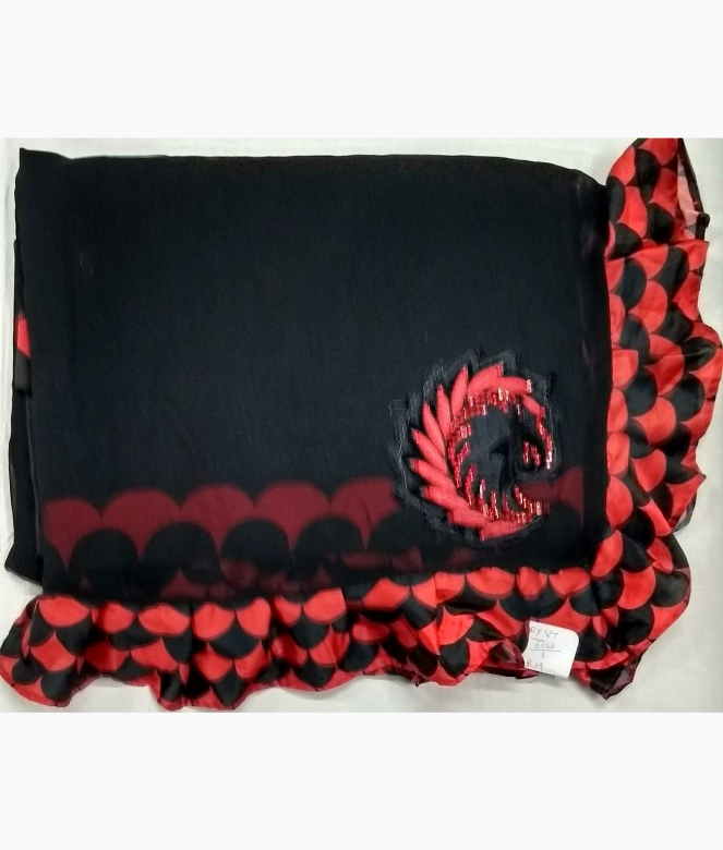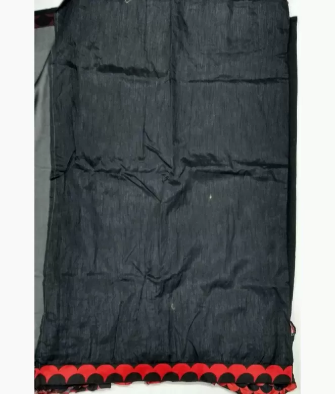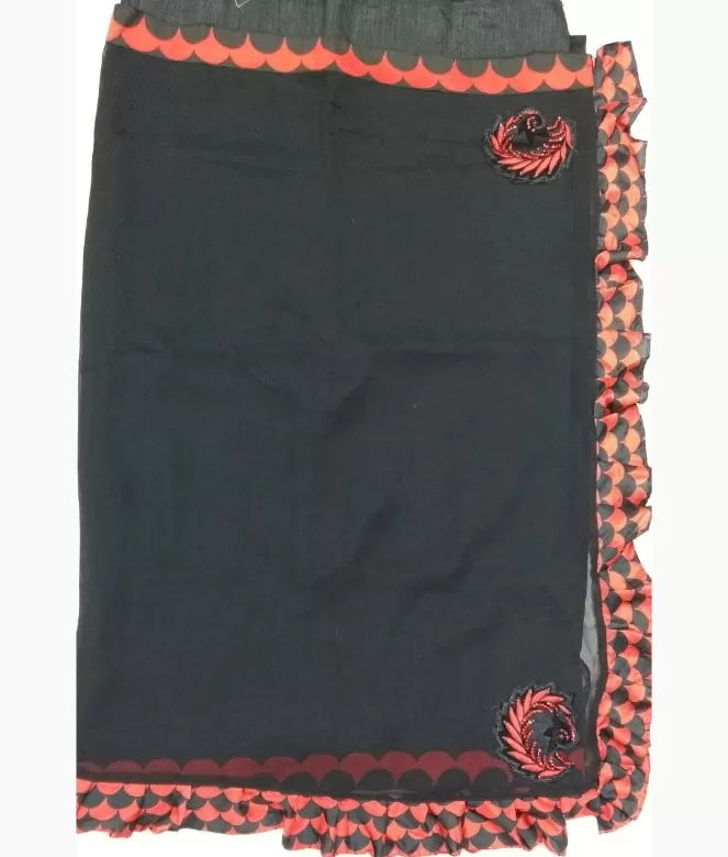 Frill design on all over saree border is of round design printed fabric in contrast colour. Blouse is of row silk fabric with matching same frill design patti for sleeves.