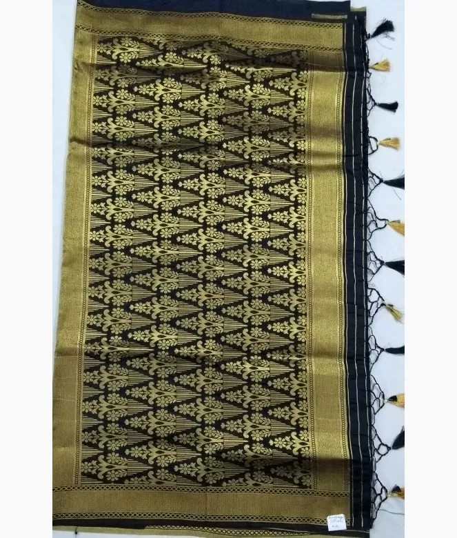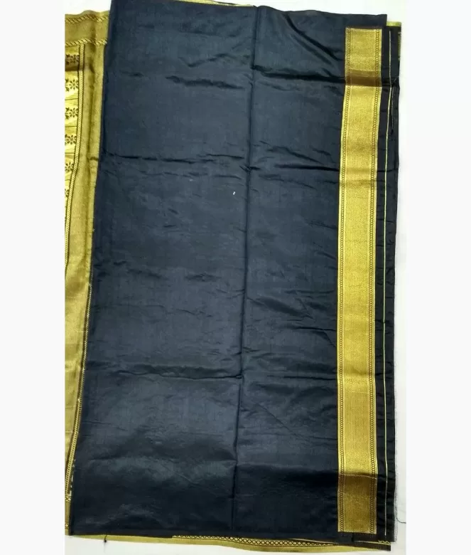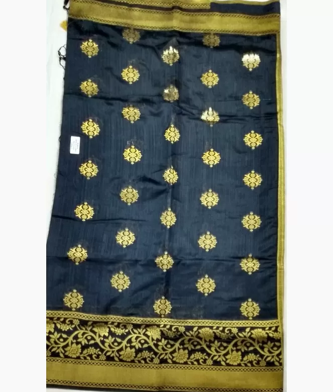 Border is of golden colour leaf flower design of zari work with golden colour zari Patti on saree. Matching same border of saree is on blouse for neck and sleeves.