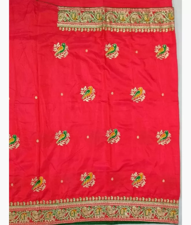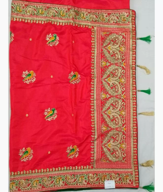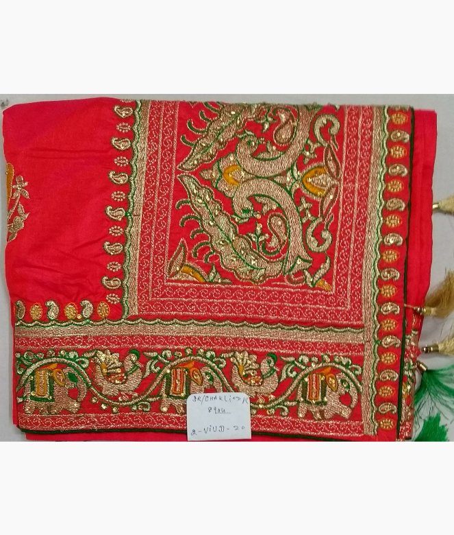 Heavy pallu of zari and multi colour thread work of peacock design with latkan on saree. Border is of elephant design with multi colour thread, zari and sequence work of high quality and fine work on all over saree. Matching work of saree border is on blouse for neck only with piping.