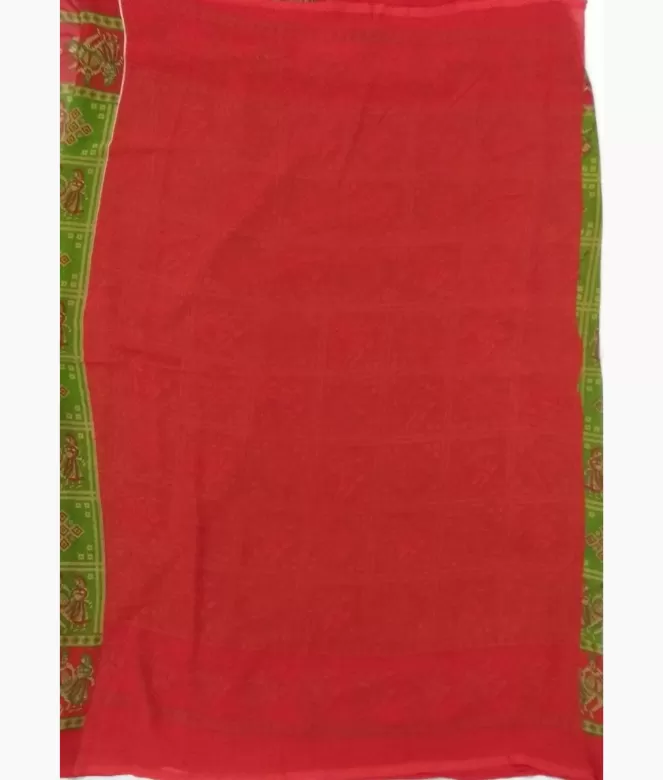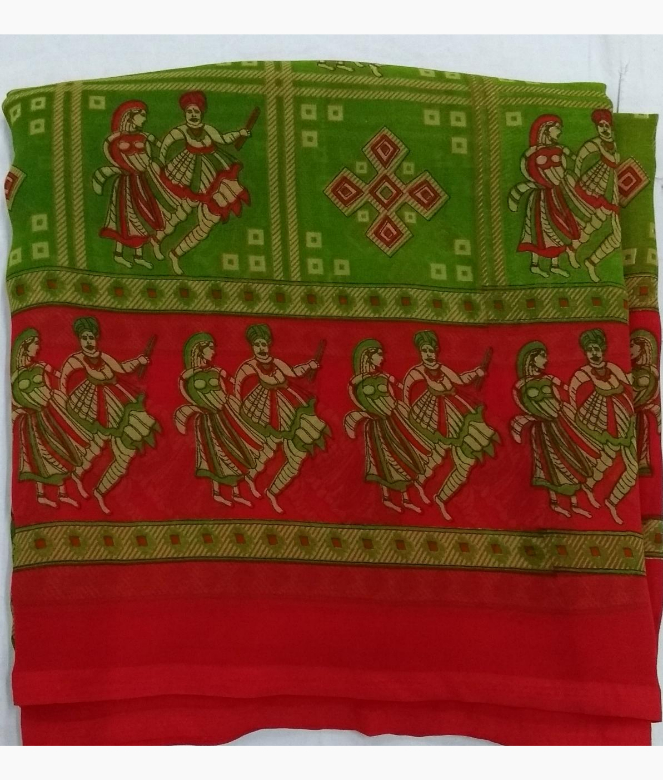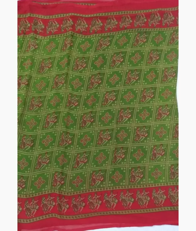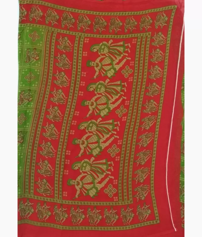 Border is of dancing animated image with contrast patti on saree. Matching same fabric plain blouse is on saree in contrast colour.
