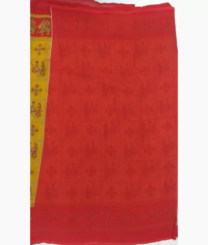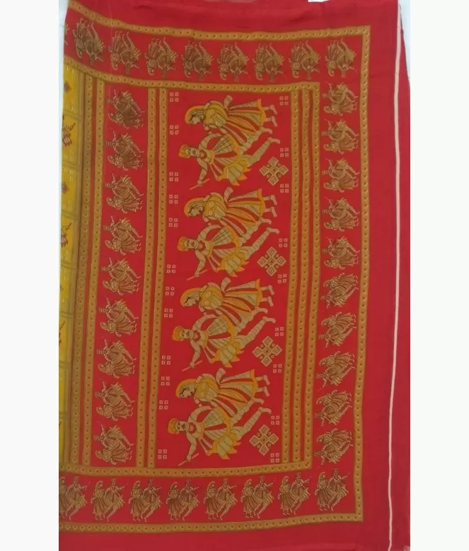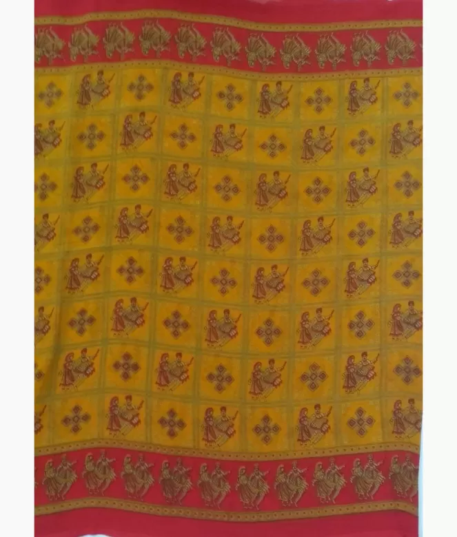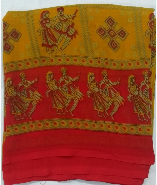 Border is of dancing animated image with contrast patti on saree. Matching same fabric plain blouse is on saree in contrast colour.