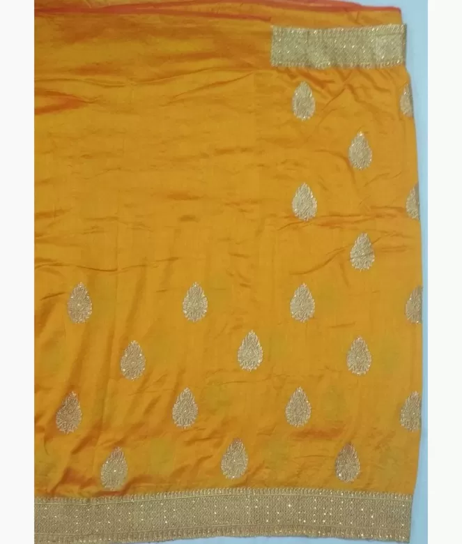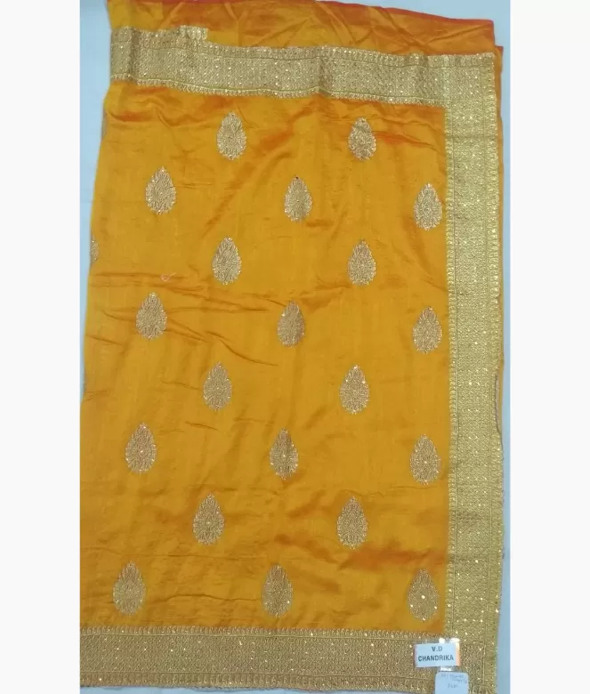 All over golden colour zari ambi design on saree. Sequence work on ambi design boota on saree.
