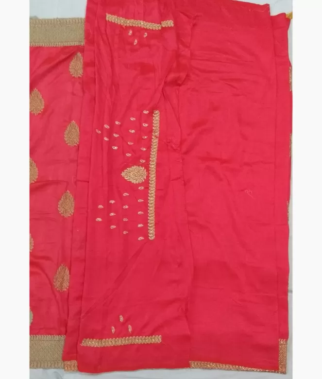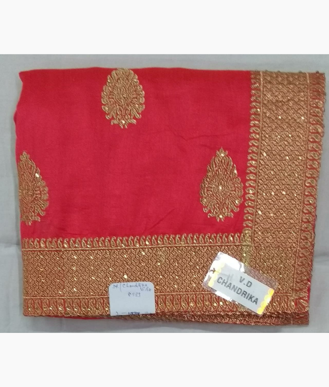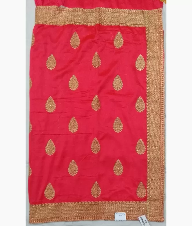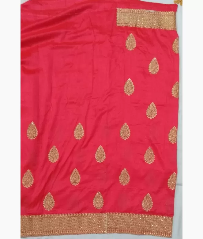 Border is of golden colour zari with heavy jaal and sequence work on saree. Matching work of saree border is on blouse for neck and sleeves.