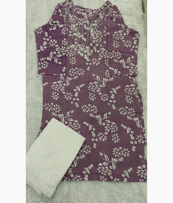 Home  /  Kurti  /  Daily Wear Kurti / Charming Stitched Embroidery Purple Proshin Print Kurti With Pant Collection