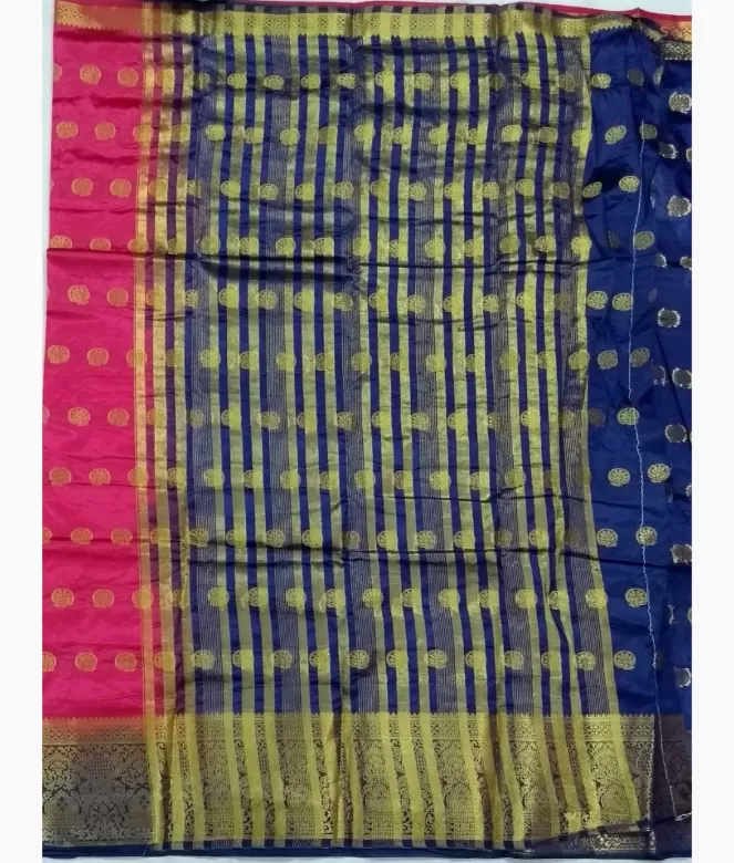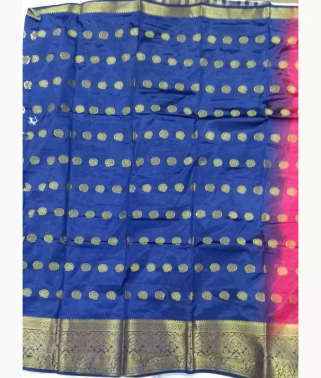 All over golden colour zari round design boota on saree. Pallu is in contrast blue colour with golden colour zari round boota and heavy strips design looks beautiful.