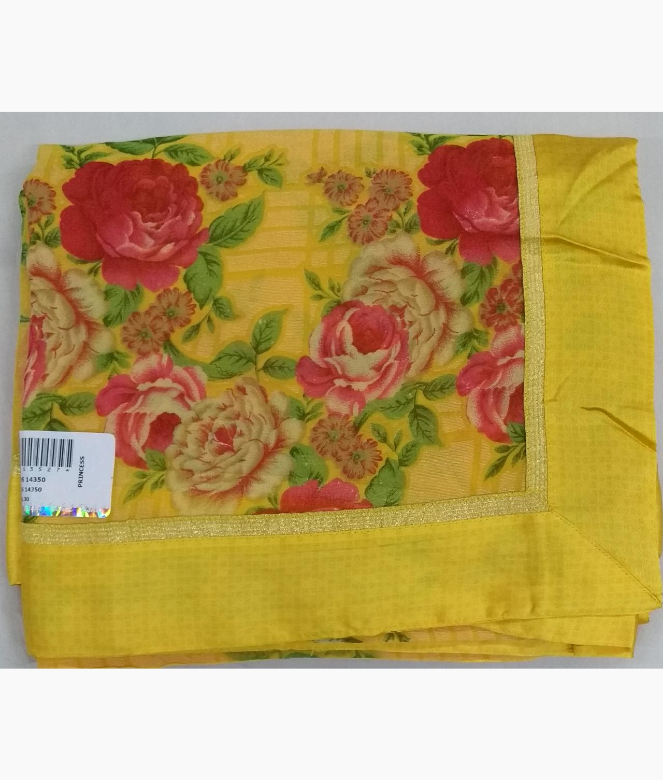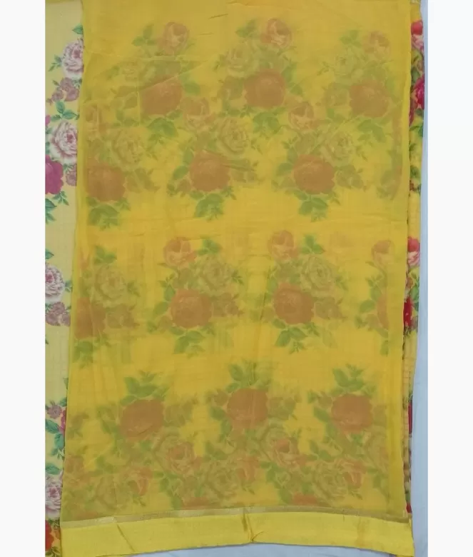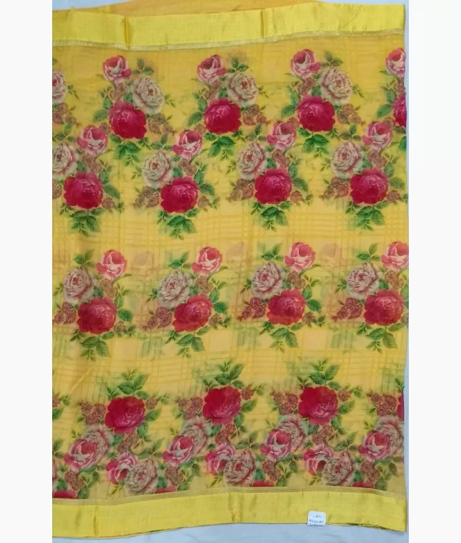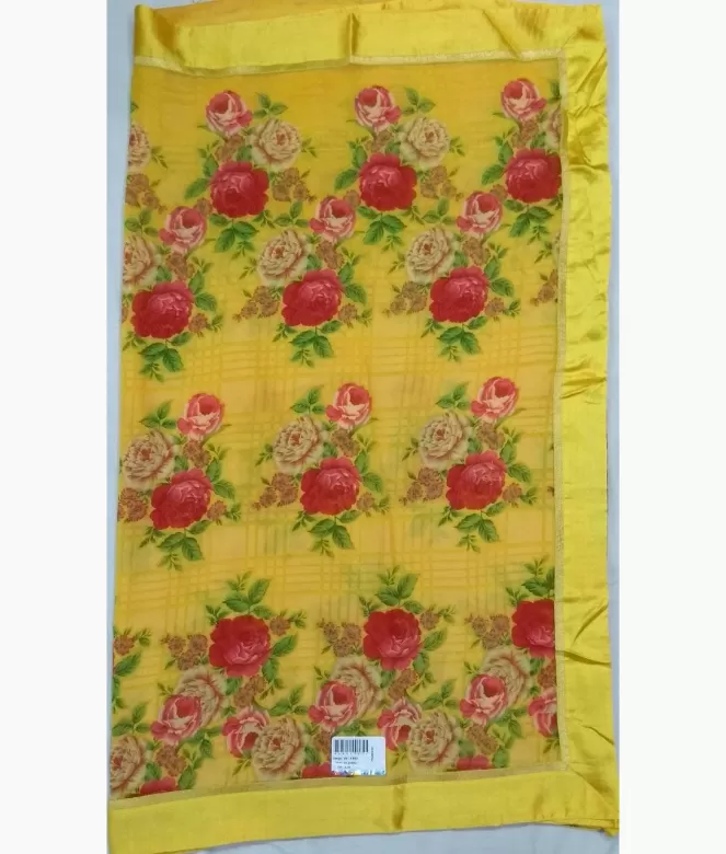 All over multi colour leaf and flower. Design printed saree with border. Border is of satin patta design on saree.
