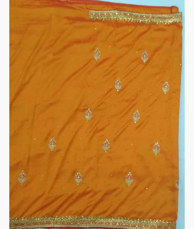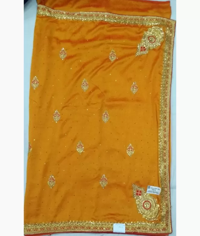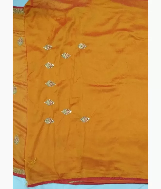 Big boota in golden colour stone and zari with sequence and red colour thread on corner of pallu. Border is of red colour flower with zari and stone with sequence of fine quality of work on the saree. Matching work of saree border is on blouse for neck with piping for sleeves.