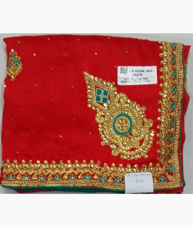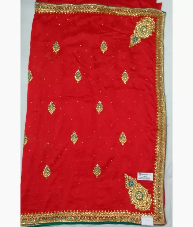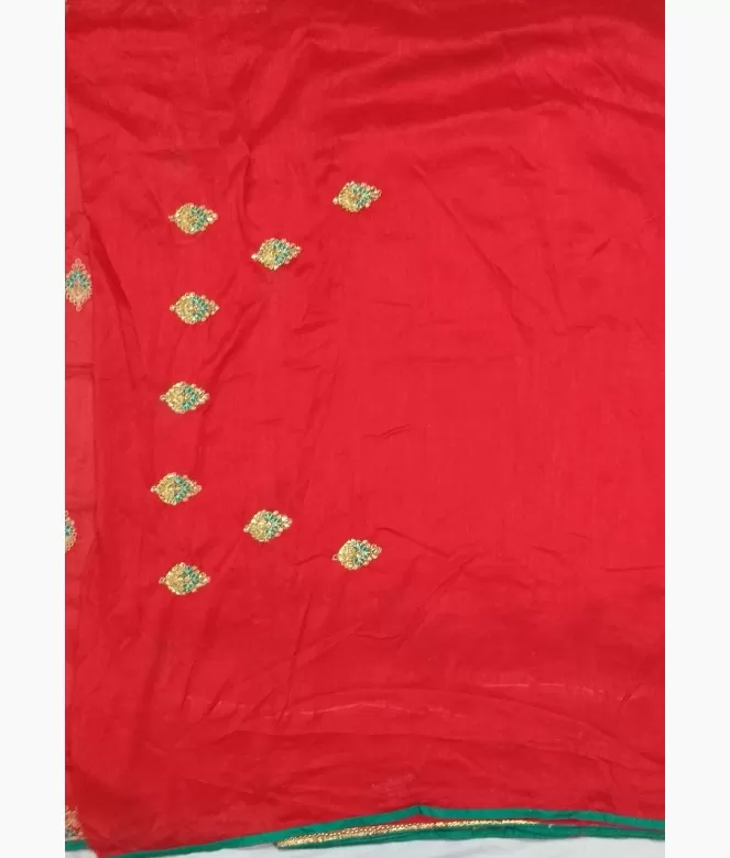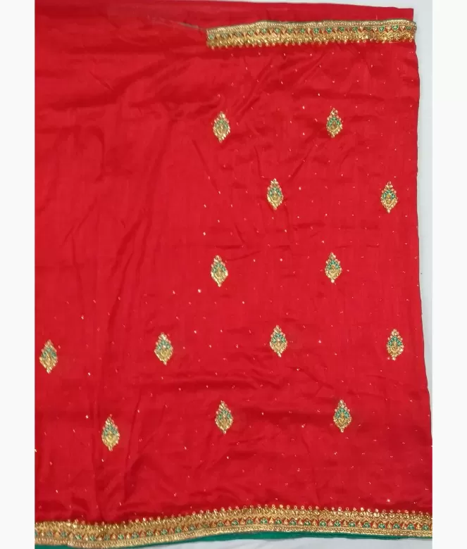 Big boota in golden colour stone and zari with sequence and red colour thread on corner of pallu. Border is of red colour flower with zari and stone with sequence of fine quality of work on the saree. Matching work of saree border is on blouse for neck with piping for sleeves.