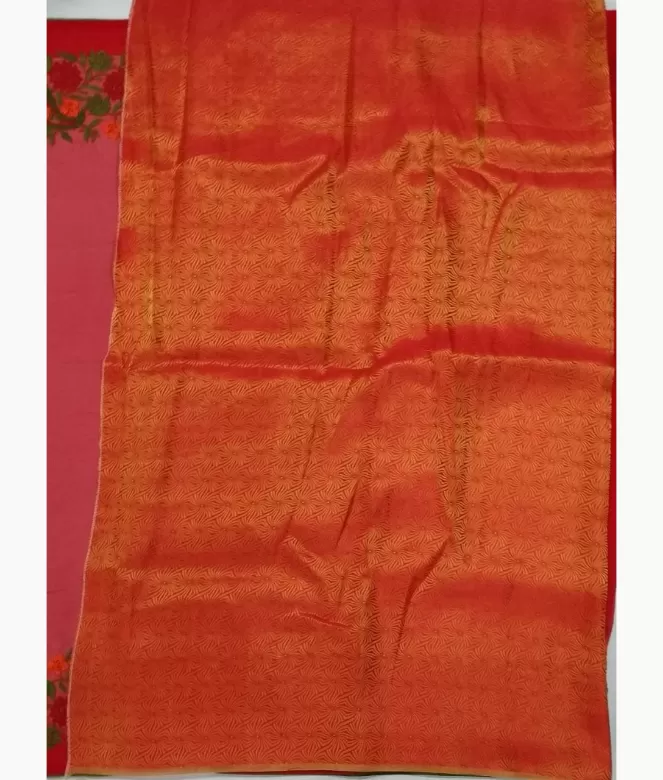 Border is of gota zari and surrounding piping on all over saree. Blouse is of brocket silk with brocket jaal weaving for neck, sleeves and back.