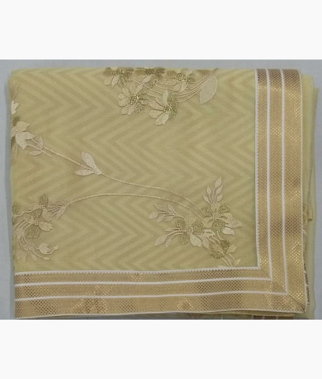 Big flower design thread boota with zari on all over saree. Fine quality three layer gota patti work on border. Blouse is of brocket silk with zig zag weaving work for neck, sleeves and back