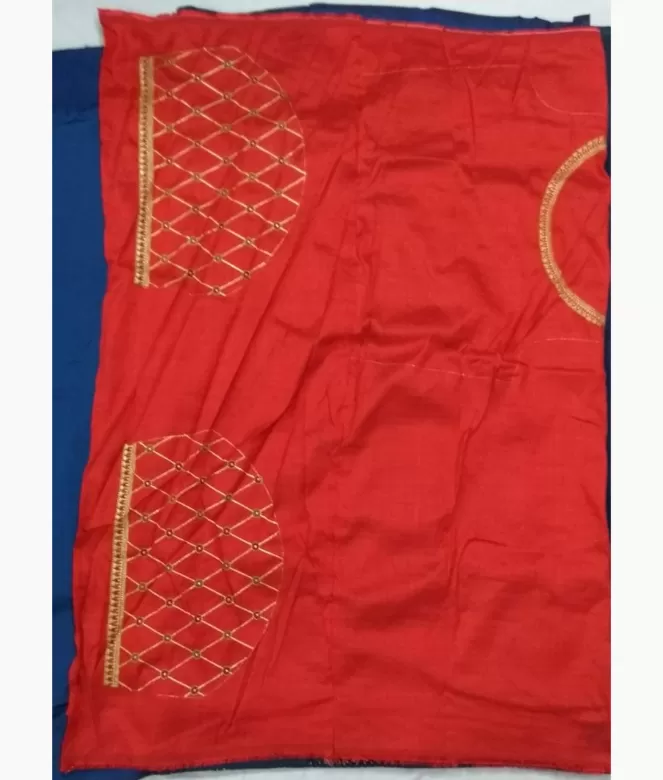 Border is of leaf and flower with multicolour thread and jari work on saree. Blouse is of contrast colour with fine work of zari thread for neck and sleeves.