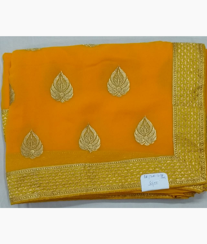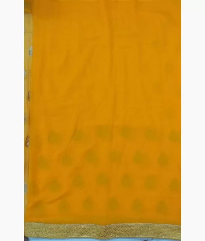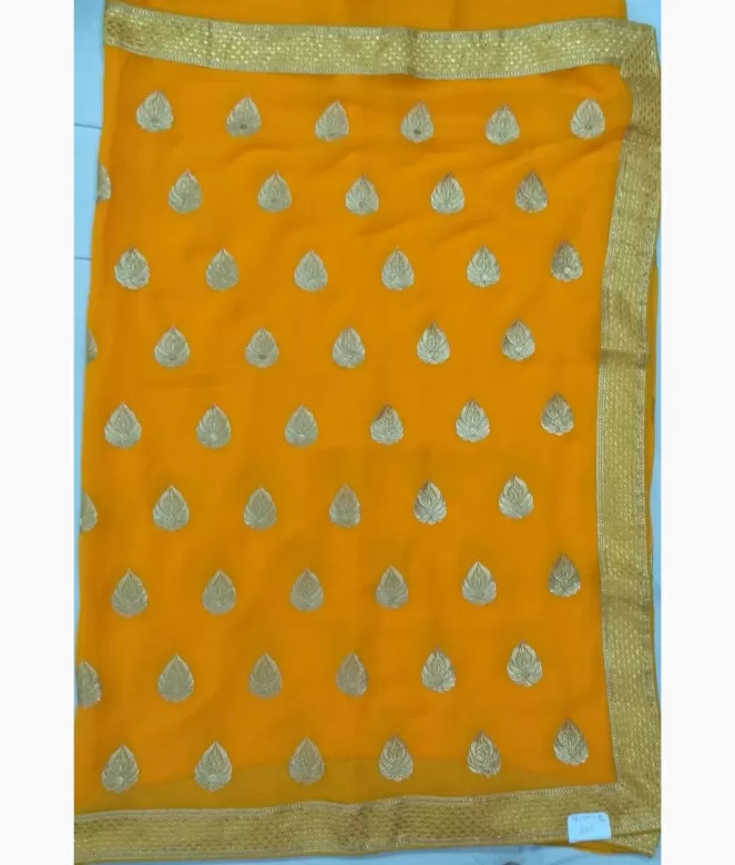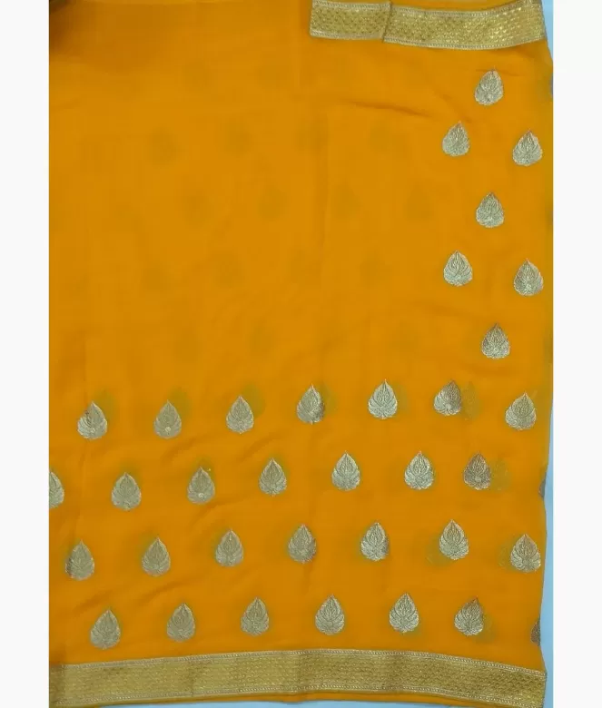 Border is of golden colour triangle design zari with sequence work for pallu and panel of saree. Matching same border of saree is on blouse patti for neck and sleeves.