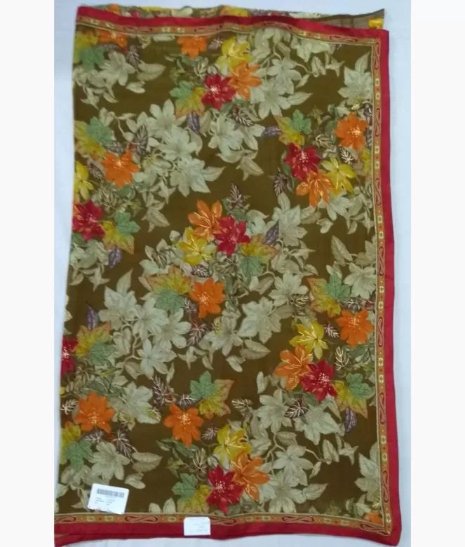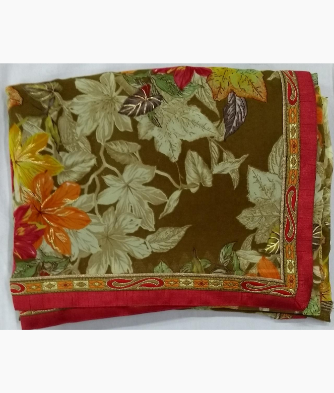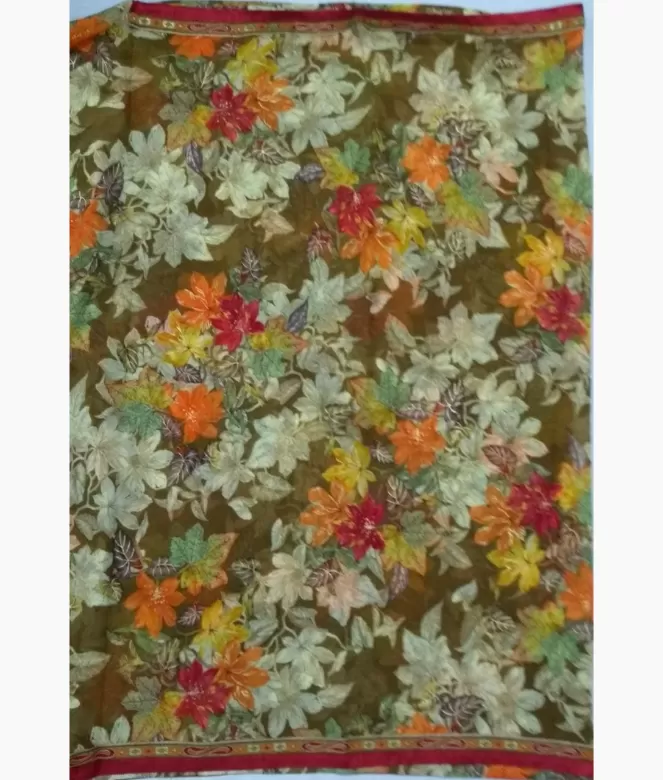 All over leaf and flower multi colour flower print design with unique golden colour brush printing on flower design all over on saree.