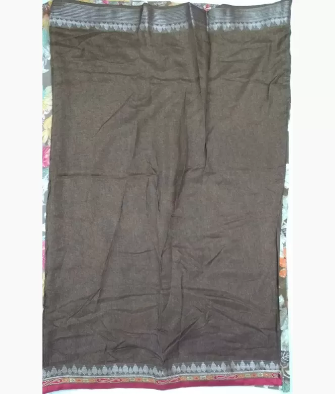 Border is of double multi colour thread and zari work with contrast colour broad piping surrounding all over saree. Blouse is of dupion silk fabric with same border of saree along zari tree design double border on blouse patti for back, neck and sleeves.