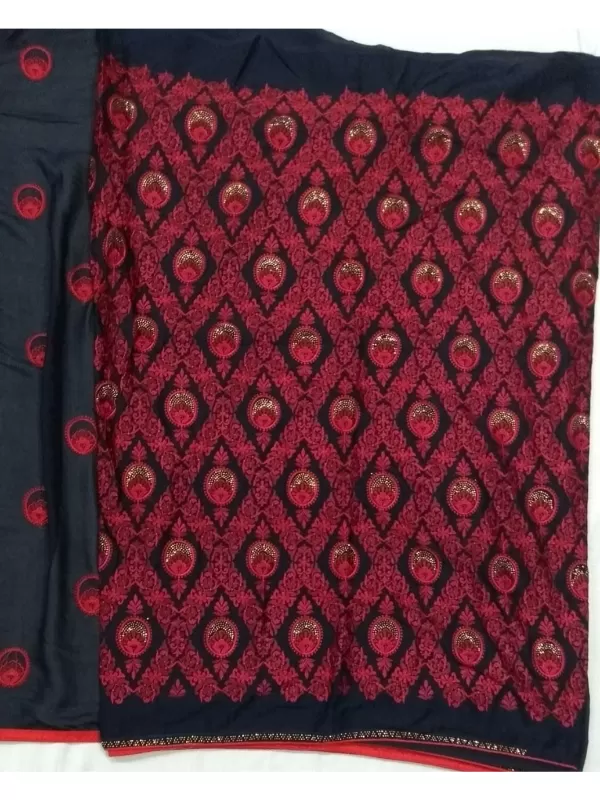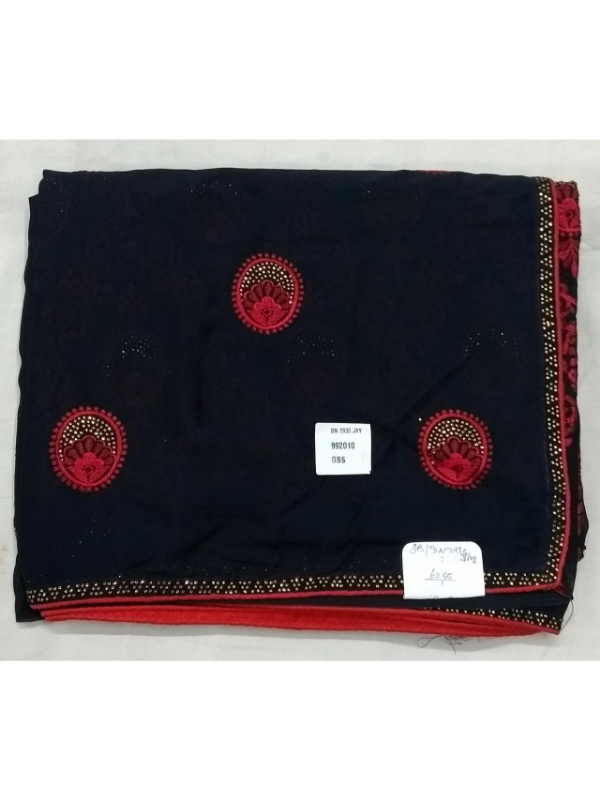 Border is of red colour piping with sequence work on saree. Blouse is of matching saree work with heavy jaal for neck, sleeves and back.