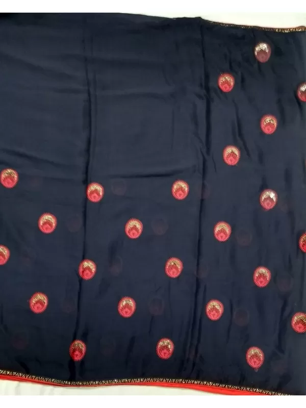 All over multi colour thread square booty design on saree with high quality of sequence work. Big booty of red colour thread on all over saree. Border is of red colour piping with sequence work on saree. Blouse is of matching saree work with heavy jaal fo