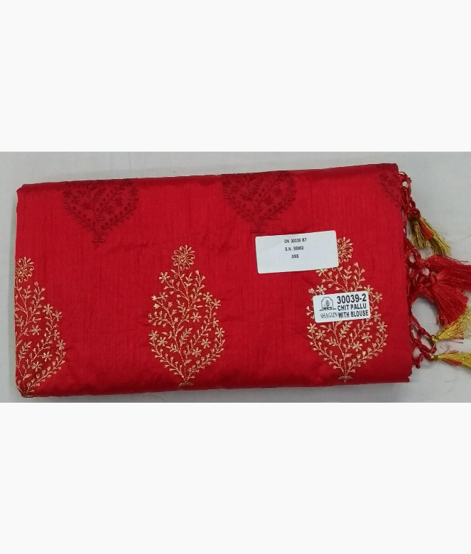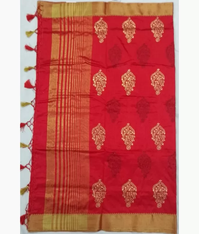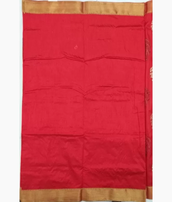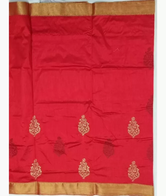 Border is of golden colour zari Patti design on saree. Matching same border of saree is on blouse patti for neck and sleeves.