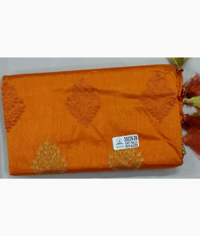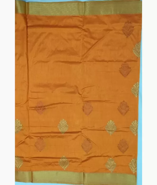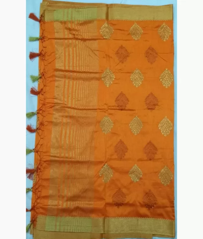 All over self colour thread and zari. Big leaf design self colour and golden colour zari booty on saree. Pallu is of golden colour zari strips with latkan on saree.