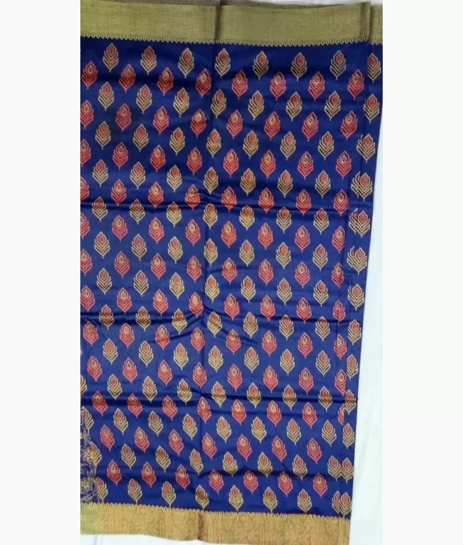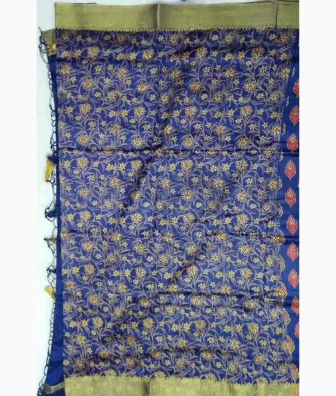 Border is of golden colour designed zari patti. Blouse is of all over flower leaf print jaal with matching same border of saree for neck and sleeves.