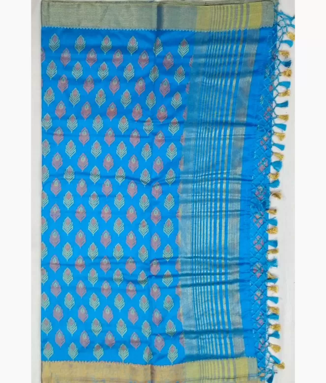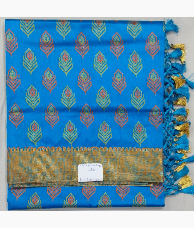 All over printed photogenic leaf design in multicolour on saree. Pallu is of golden strips with latkan and weaving on border.