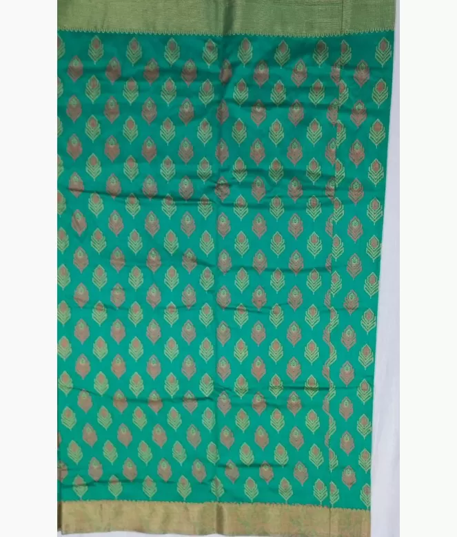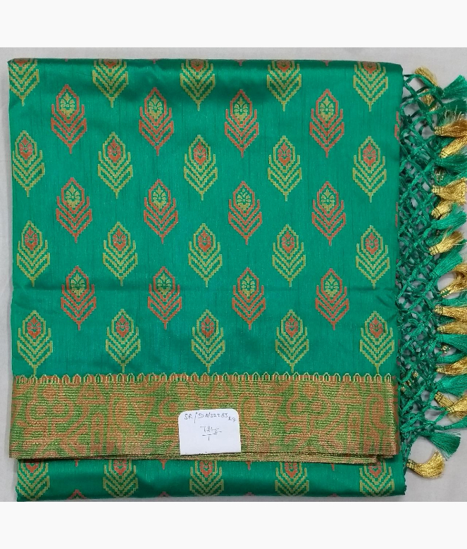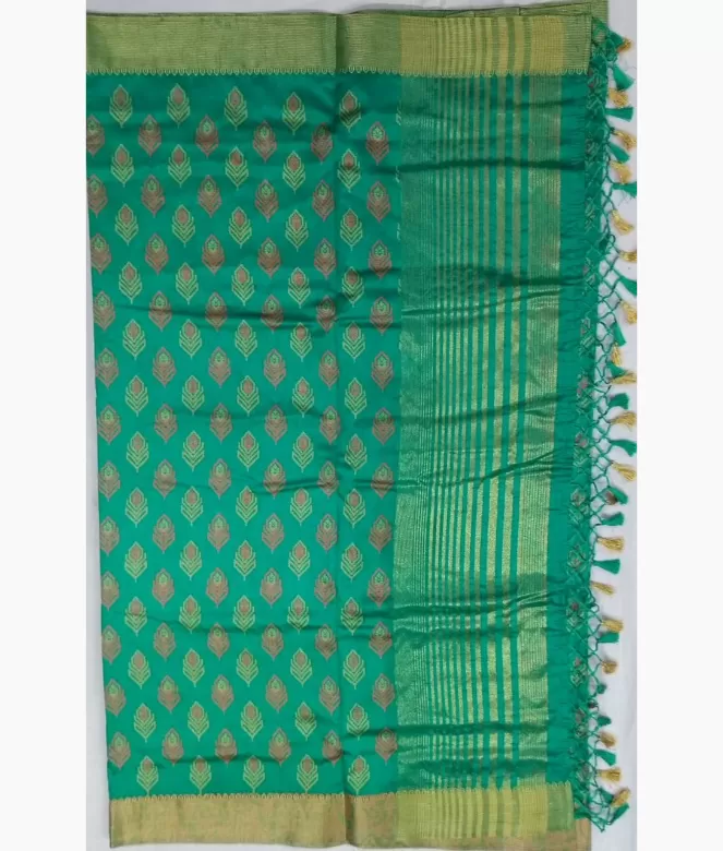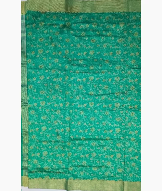 Border is of golden colour designed zari patti. Blouse is of all over flower leaf print jaal with matching same border of saree for neck and sleeves.