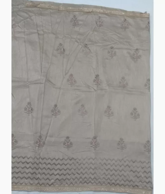 All over self colour thread flower boota design jaal on saree. Border is of lehariya design with parallel design sequence work on saree.