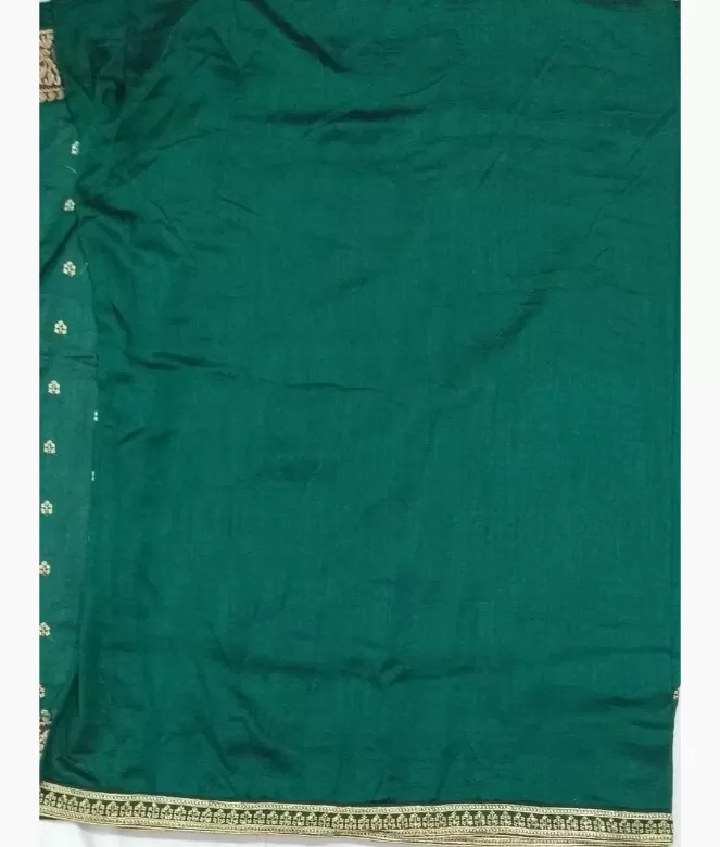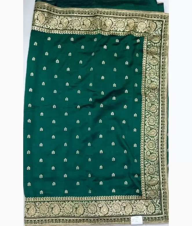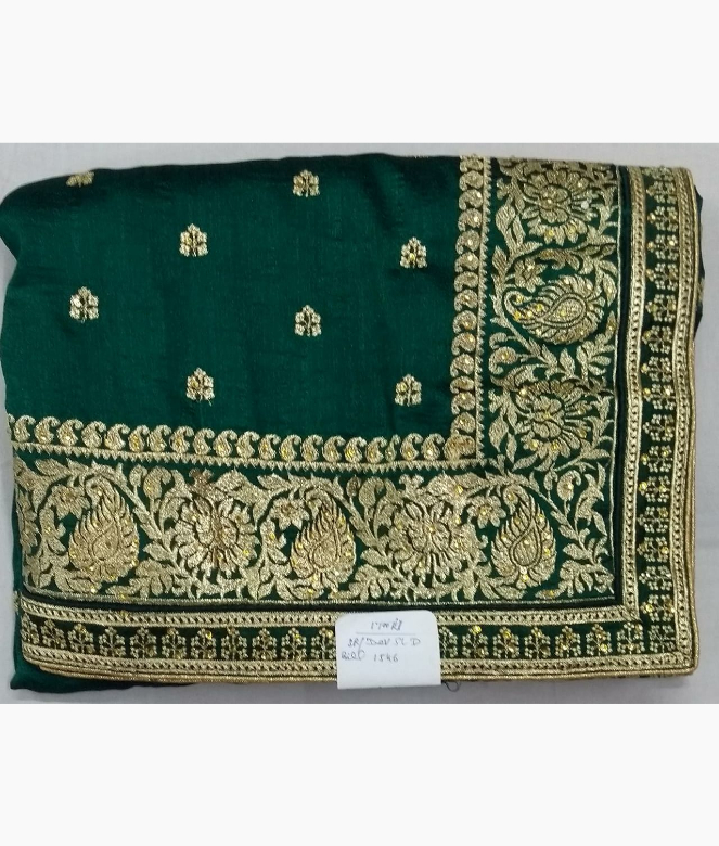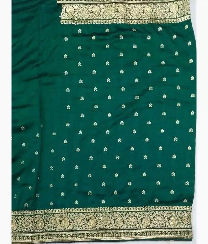 Big leaf in golden colour zari jaal on border and double small flower booty jaal with sequence work on border of saree. Matching work of saree border is on border for neck and sleeves.