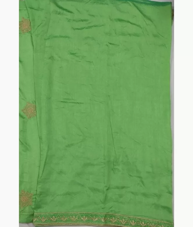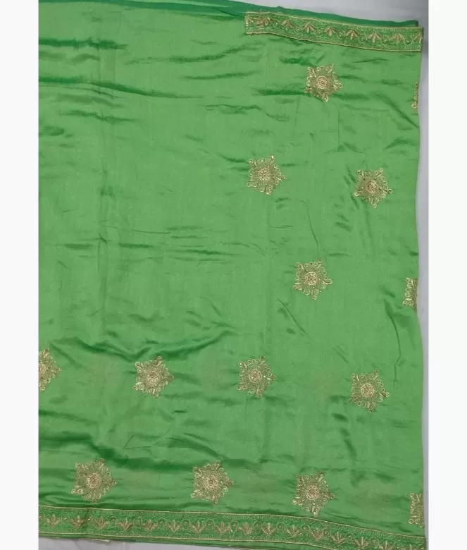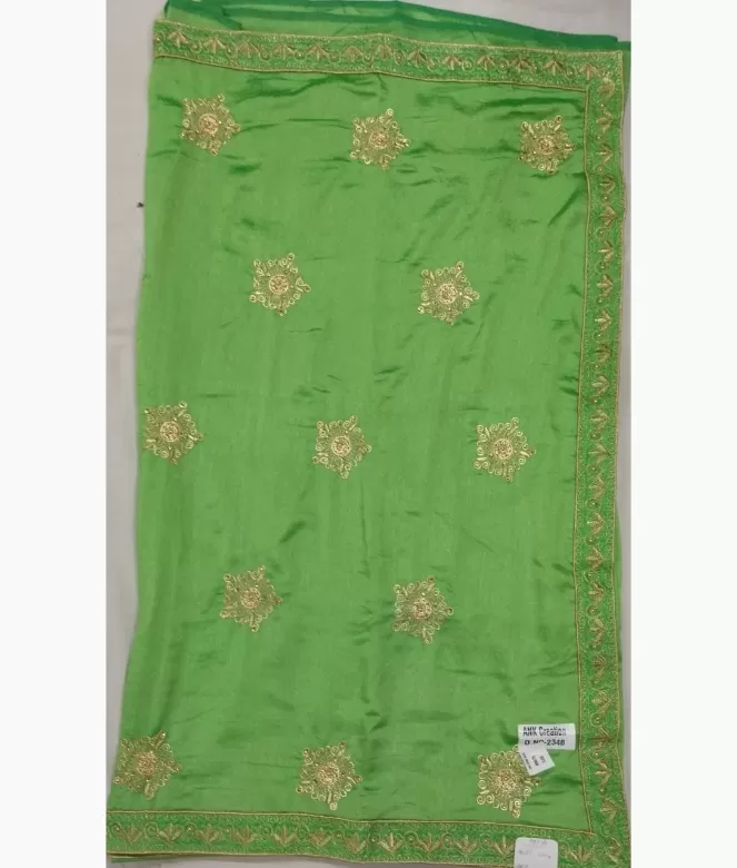 Border is of golden colour piping with leaf design zari work and golden colour moti work. Matching same border of saree is on blouse Patti for neck and sleeves.