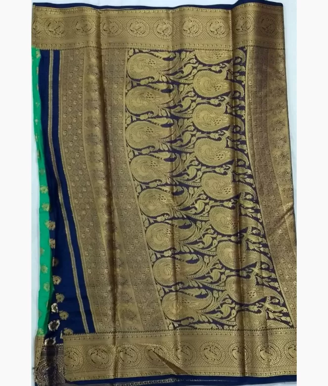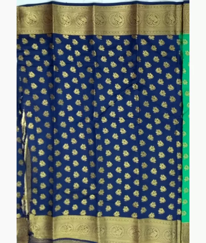 Border is of golden colour zari jaal big round design inside peacock booty in contrast blue colour of matching pallu. Blouse is of blue contrast colour of matching same work of saree.