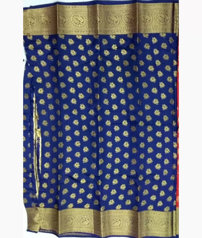 Border is of golden colour zari jaal big round design inside peacock booty in contrast blue colour of matching pallu. Blouse is of blue contrast colour of matching same work of saree.