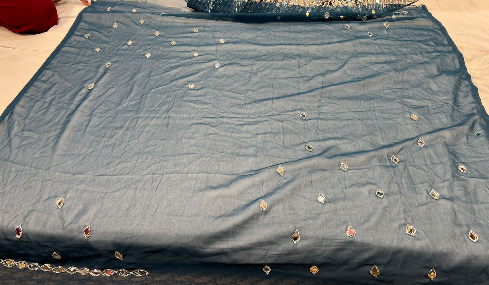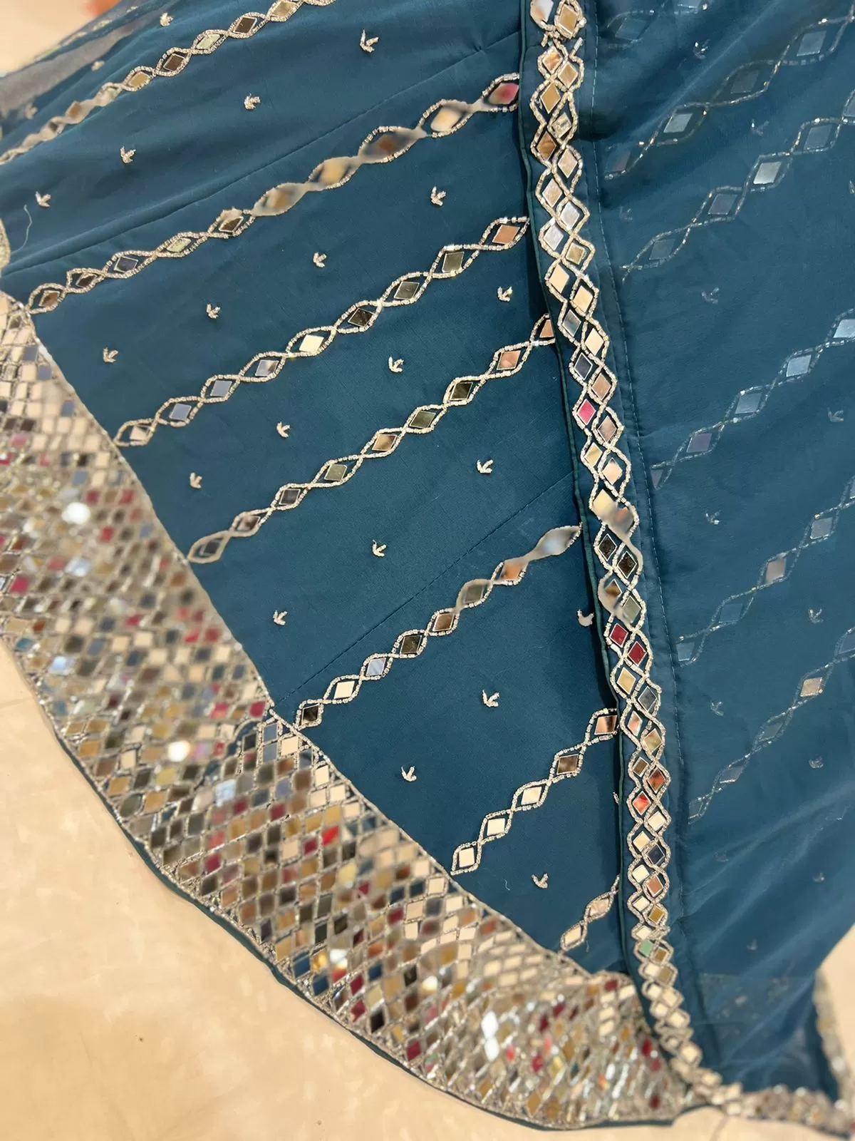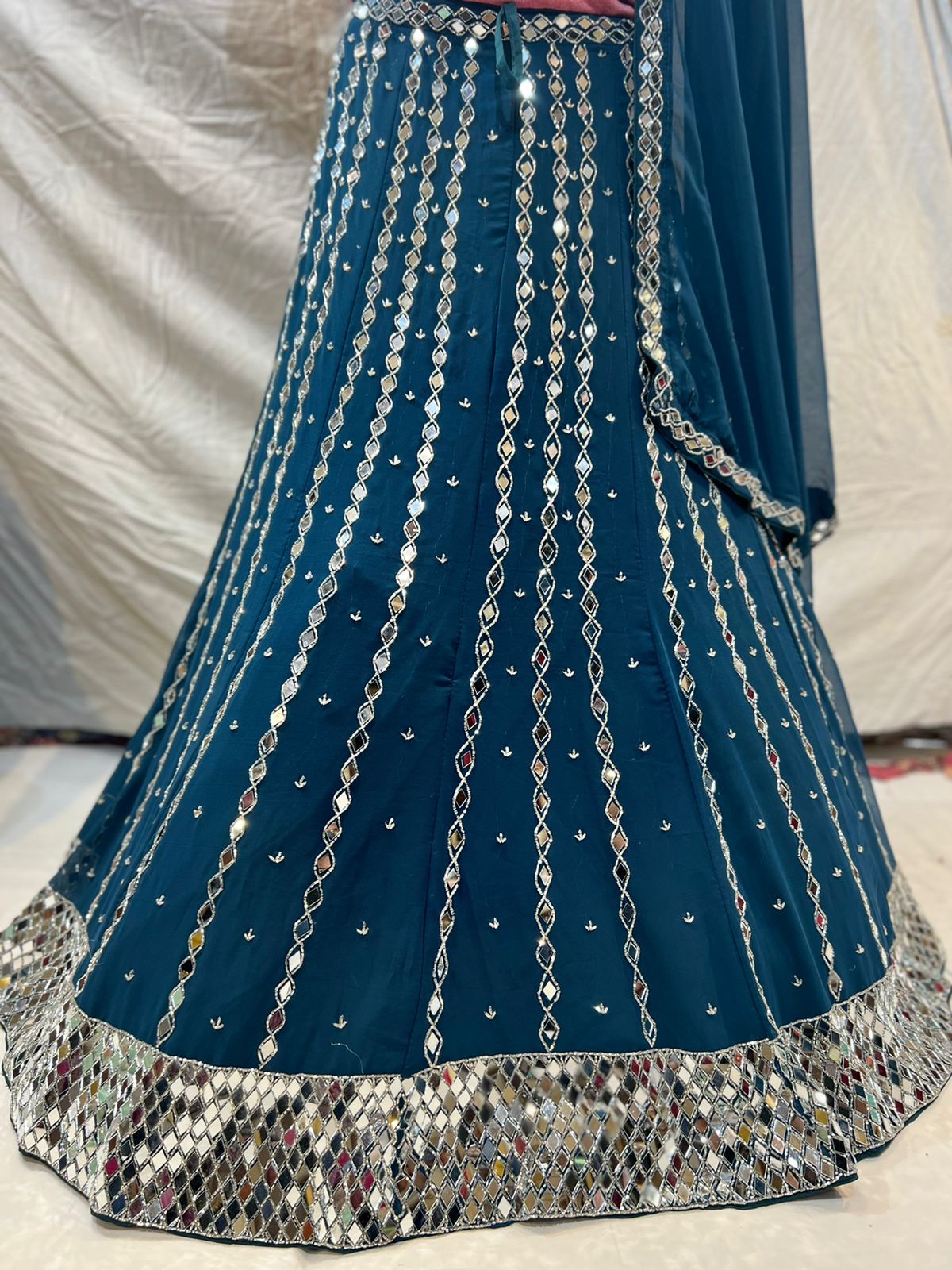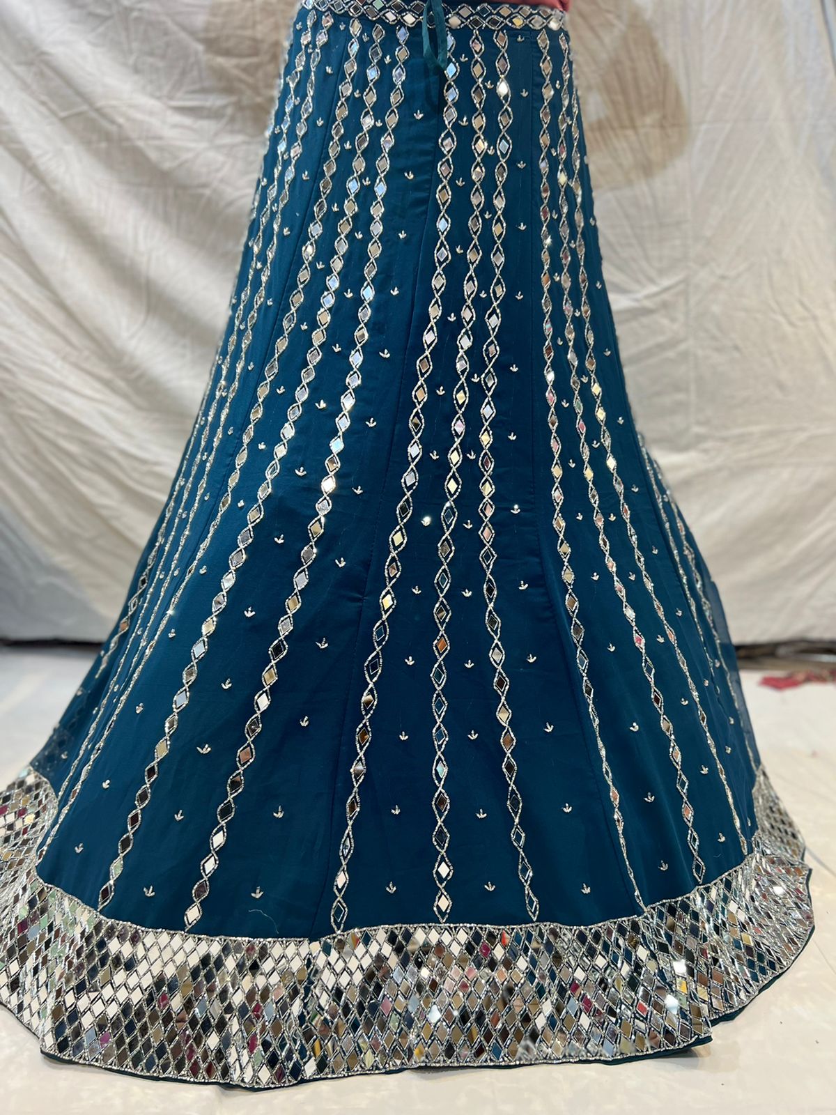 The Lehenga is designed on Georgette fabric. It has Burfi design in mirror and glass work.