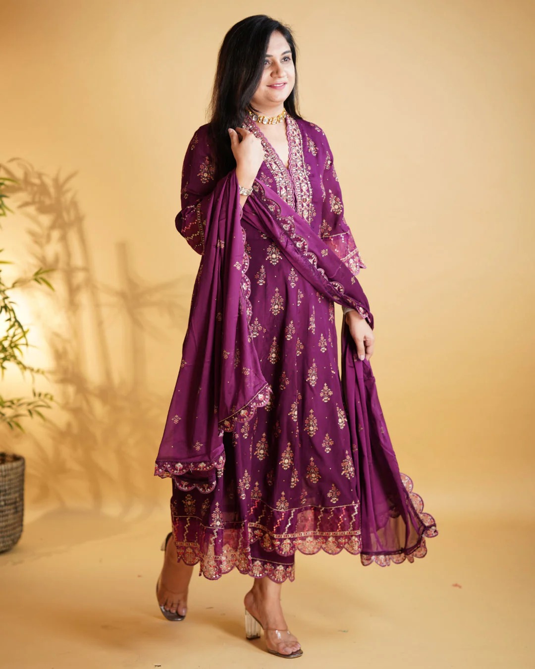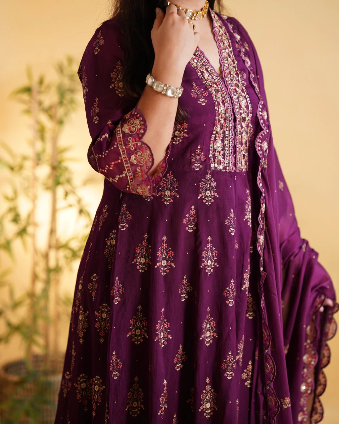 This elegant printed organza lace anarkali suit set features a beautifully designed anarkali kurta with intricate lace detailing on the neckline and sleeves.