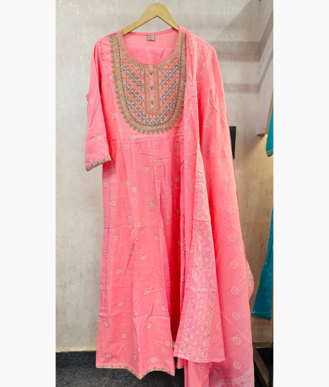 Introducing the Beautiful Rayon Pink Stitched Embroidery Suit Set, a perfect blend of tradition and elegance.