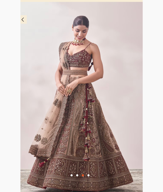 A neutral fawn base is contrasted with imperial maroon highlights and enriched with extravagant embroidery to create an ingeniously counterbalanced appeal in this bridal lehenga fashioned from luxe velvet fabric. The skirt, accessorised with a decorated waist tie is divided into panels and opulently filled with a glorious combination of paisley and floral patterns embedded with glistening stone work. Intricate floral embroidery surfaces the strappy princess cut maroon blouse which lends a beautiful contrast. The outfit is finished with a baroque waist belt and complementing dupatta.