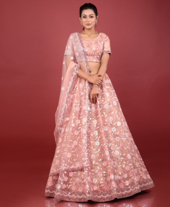 Peach lehenga with floral design and silver and pink sequins. it is made up of net fabric.