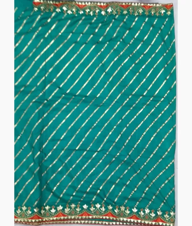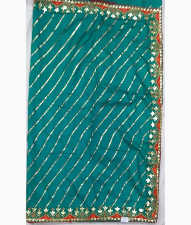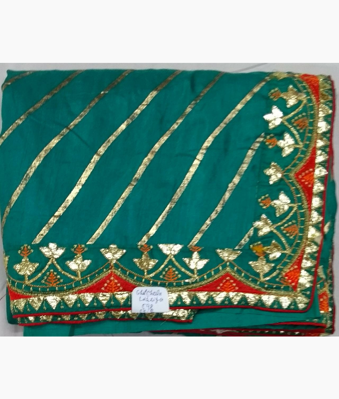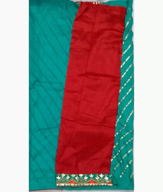 Border is of golden colour gota flower with multi colour thread and samosa design with red colour piping on saree. Blouse is of row silk fabric with matching same border of saree is in contrast red colour on blouse.