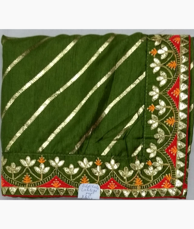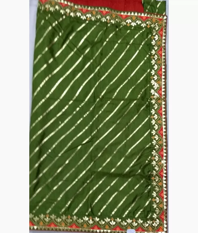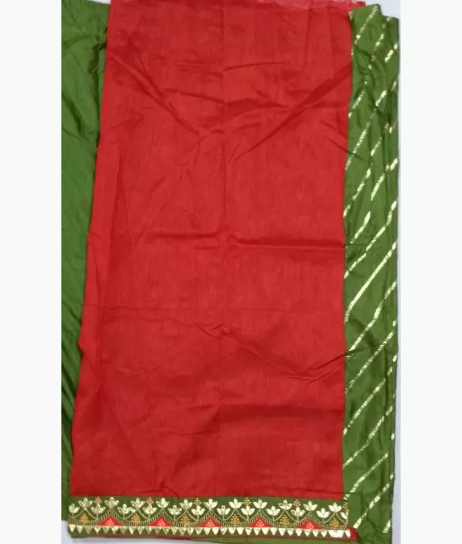 Border is of golden colour gota flower with multi colour thread and samosa design with red colour piping on saree. Blouse is of row silk fabric with matching same border of saree is in contrast red colour on blouse.